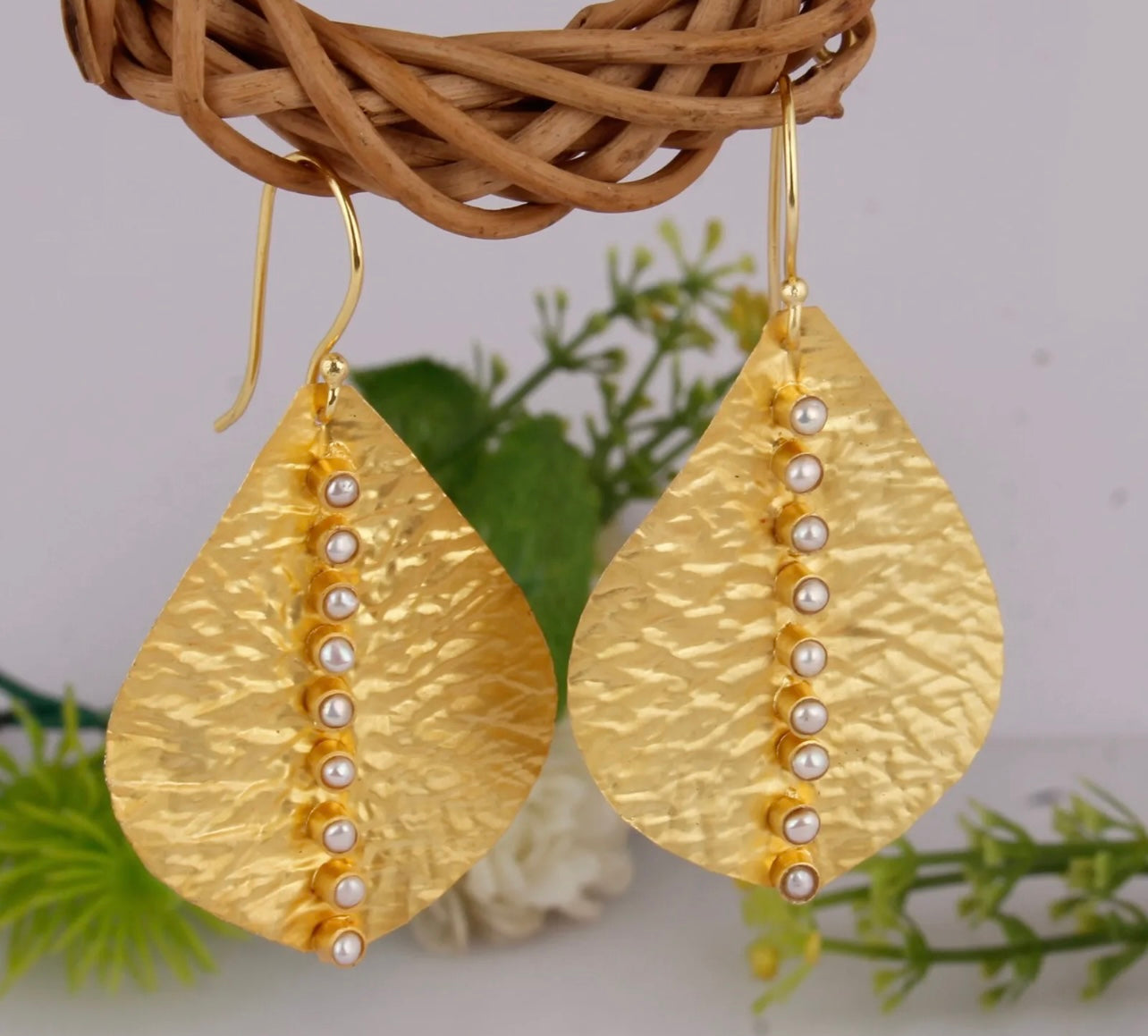Hammered 22k Gold Leaf Pearl Statement Earrings 2.5”