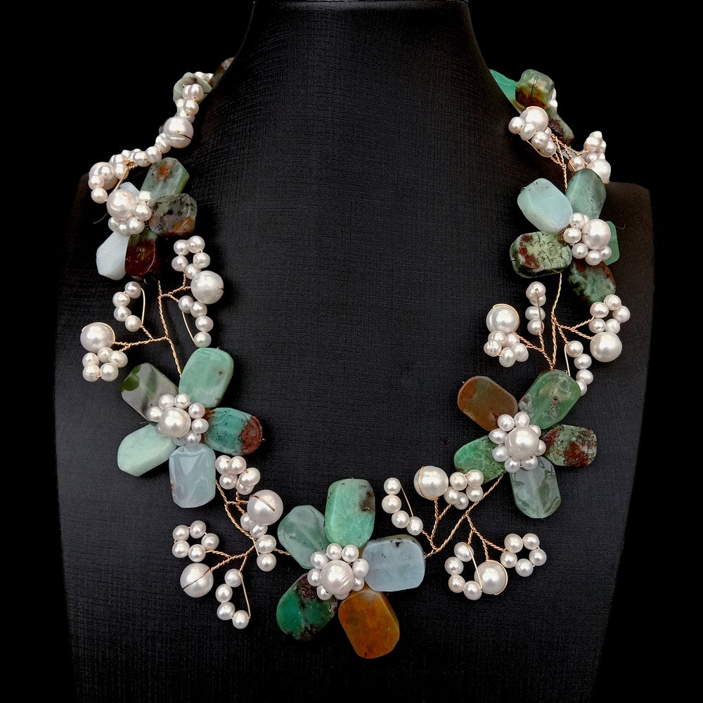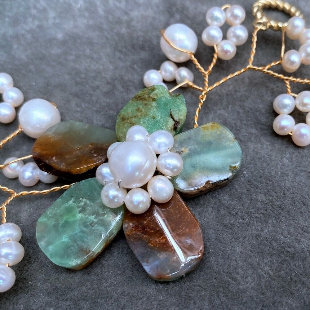 Rare Green Chrysoprase and Pearl Gemstone Flower Statement Necklace