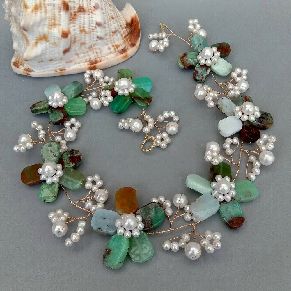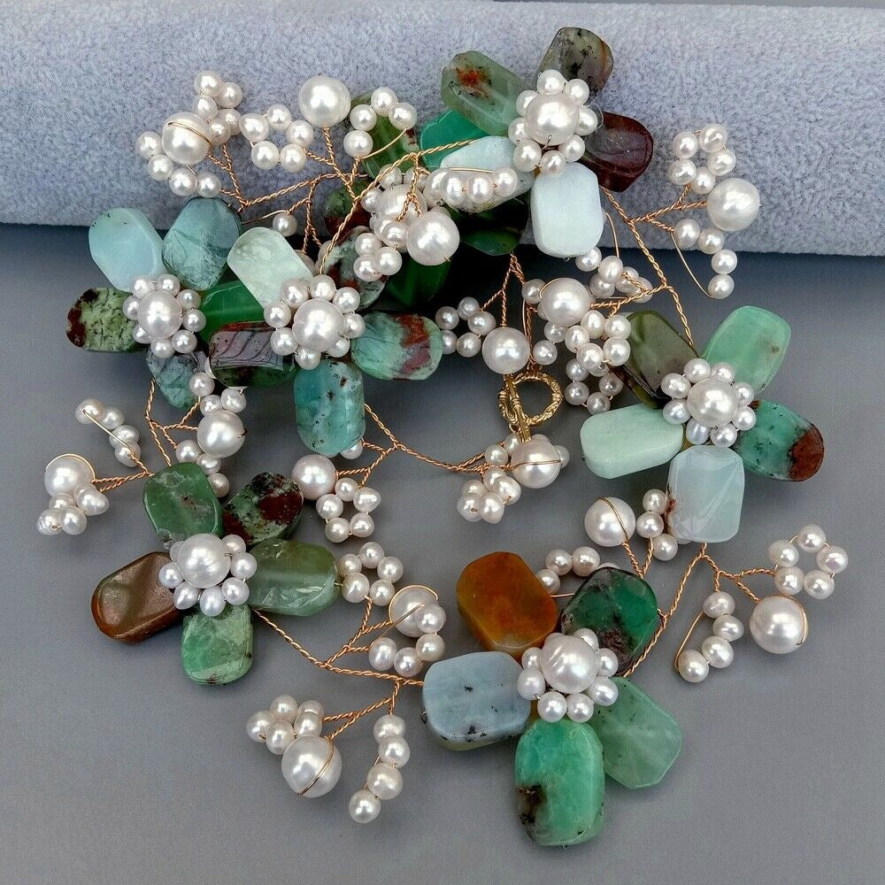 This 21" necklace is a stunning piece of artistry that beautifully combines lustrous pearls and opulent green Chrysoprase gemstones. It features delicate wire-wrapped 4-5mm and 10mm freshwater pearls and Chrysoprase gemstones, creating a stunning floral motif that is accentuated by the shining nickel glints of the precious chalcedony. Made with high-quality materials and 22k gold-filled wire, this necklace exudes modern sophistication and timeless beauty, adding a touch of luxury to any evening look.