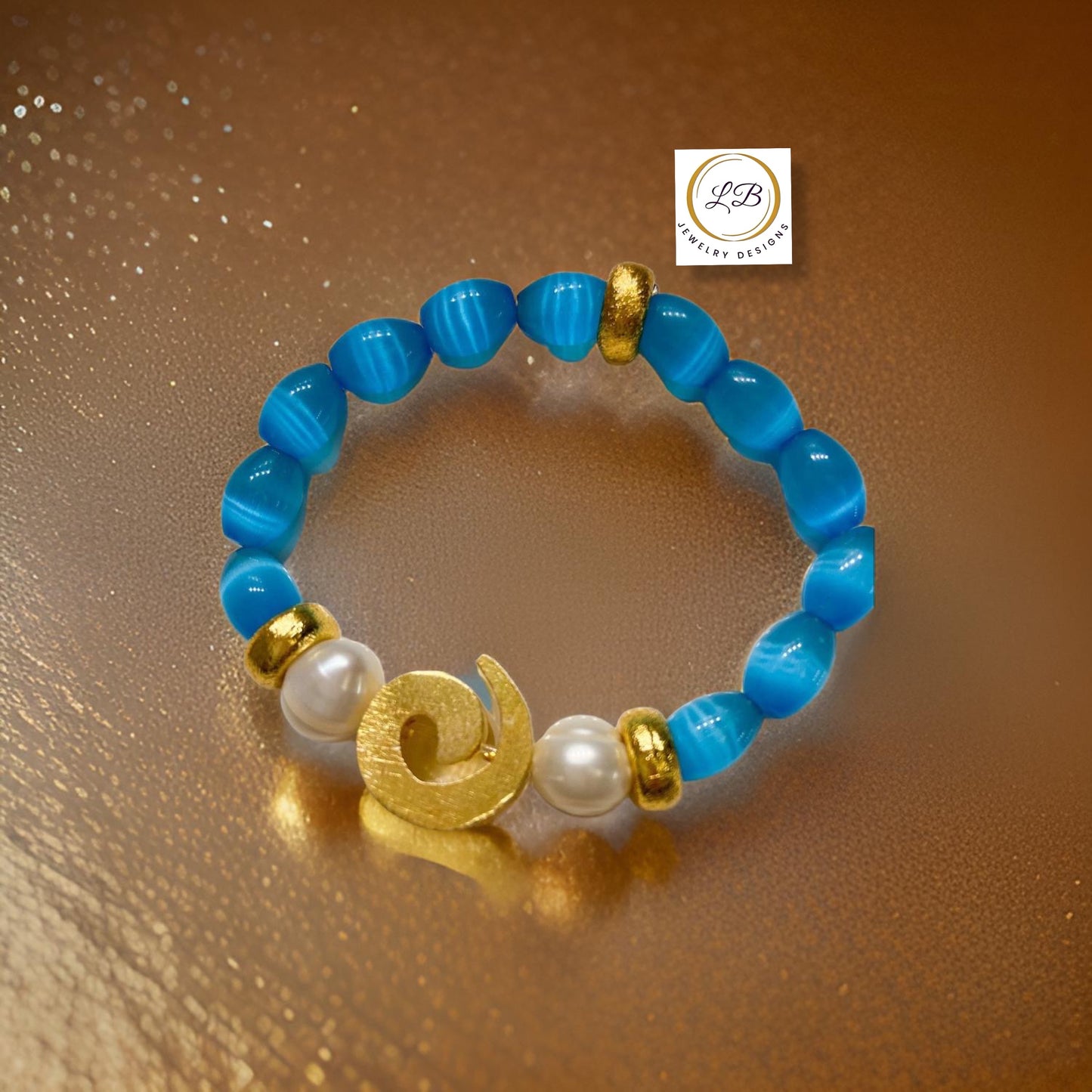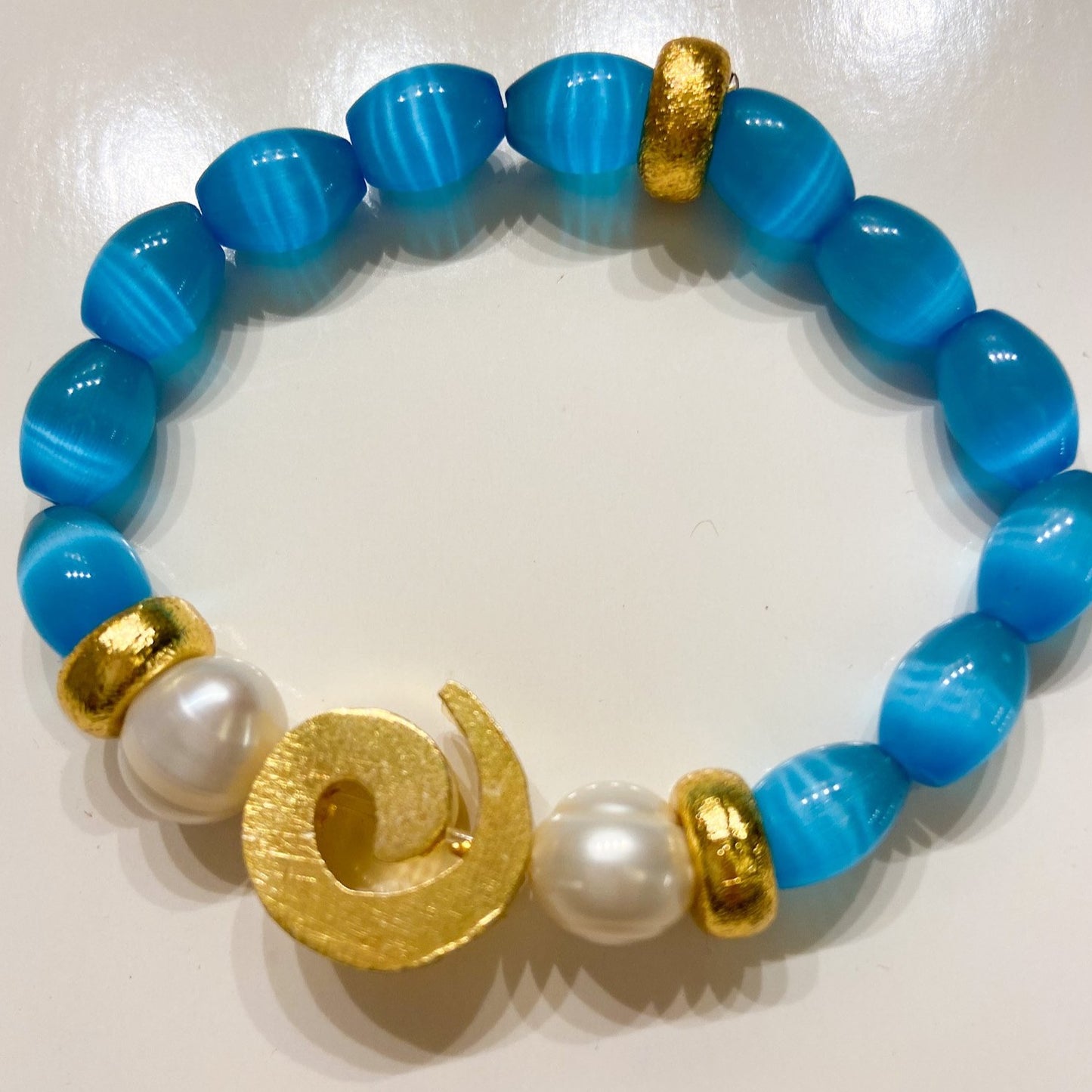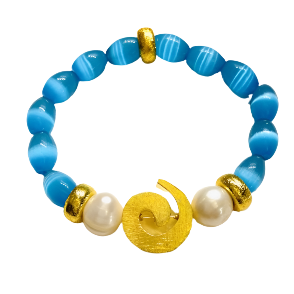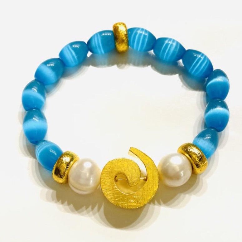 This exquisite bracelet is handcrafted and influenced by the stunning blue waters of Mexican beaches. Measuring 7", the modern and sophisticated design features a 18k brushed gold vermeil swirl center bead encircled by two 12mm freshwater baroque pearls, sky blue rice-shaped Mexican Fire Opals, and a detailed Bali end bead.