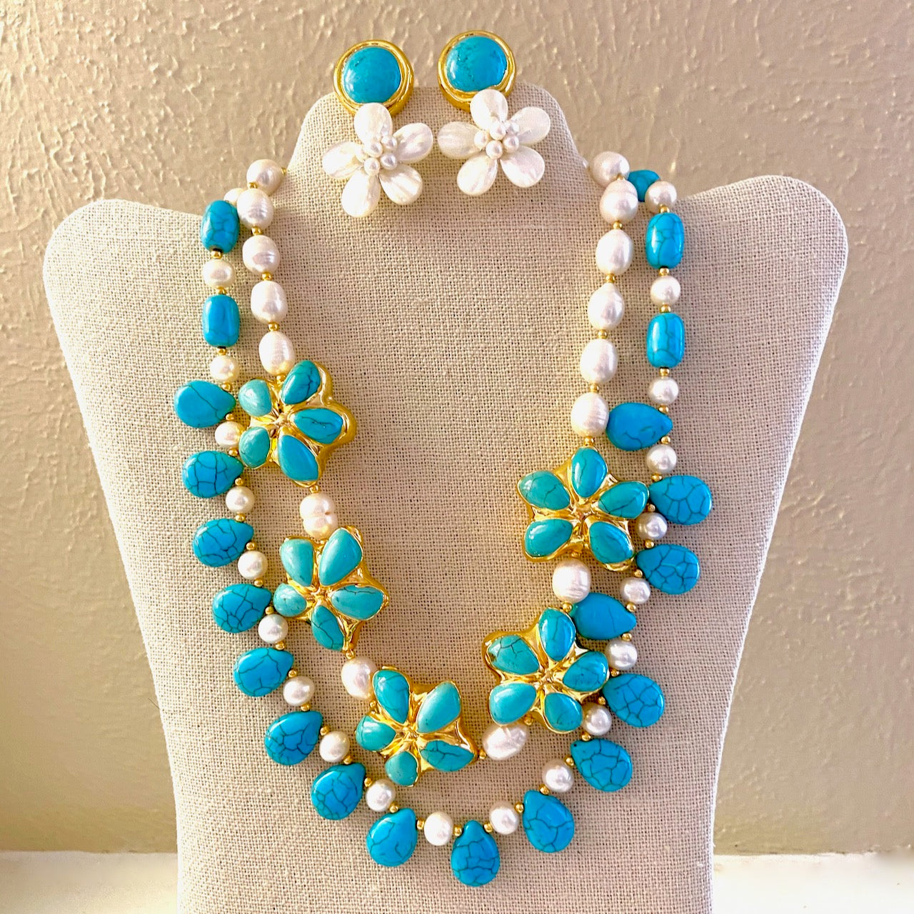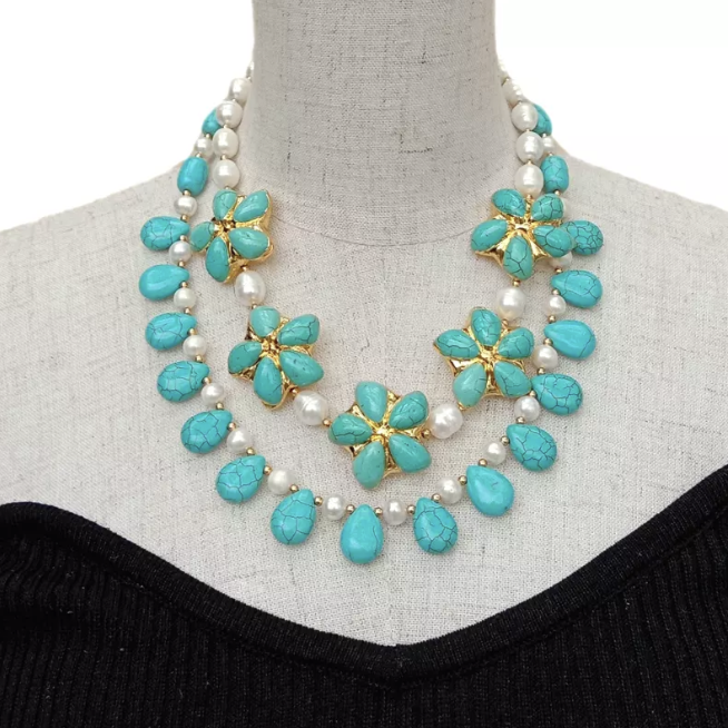 Double-Strand Turquoise & Pearl 22k Gold Statement Necklace