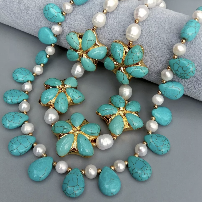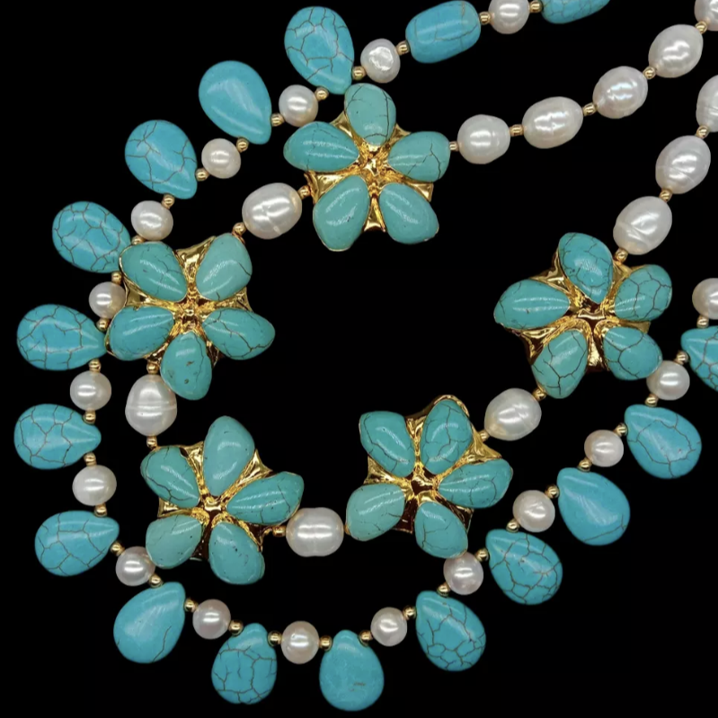 Experience elevated resort fashion with this exquisite double-strand necklace. Adorned with white pearls in varying shapes and five turquoise flower pendants, this accessory is enhanced with sparkling gemstones. Crafted with 22k gold vermeil and an 18k gold clasp, it brings a touch of glamour to any ensemble.