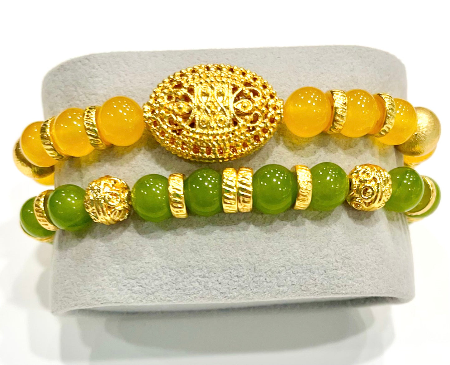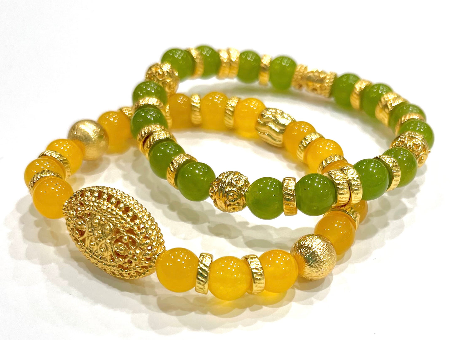 This colorful bracelet stack consists of one Green Jade gemstone 10mm bracelet with gold Bali accents. To compliment this bracelet is a yellow Onyx gemstone bracelet with a lovely 24k gold vermeil Bali center bead. Each bracelet can be worn alone or stacked as a set or find one of your own bracelets to pair with them.