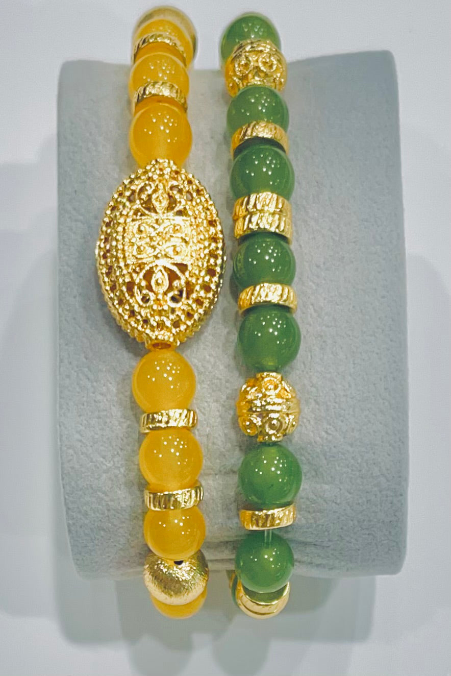Green Jade and Yellow Onyx Gold Bracelet Stack