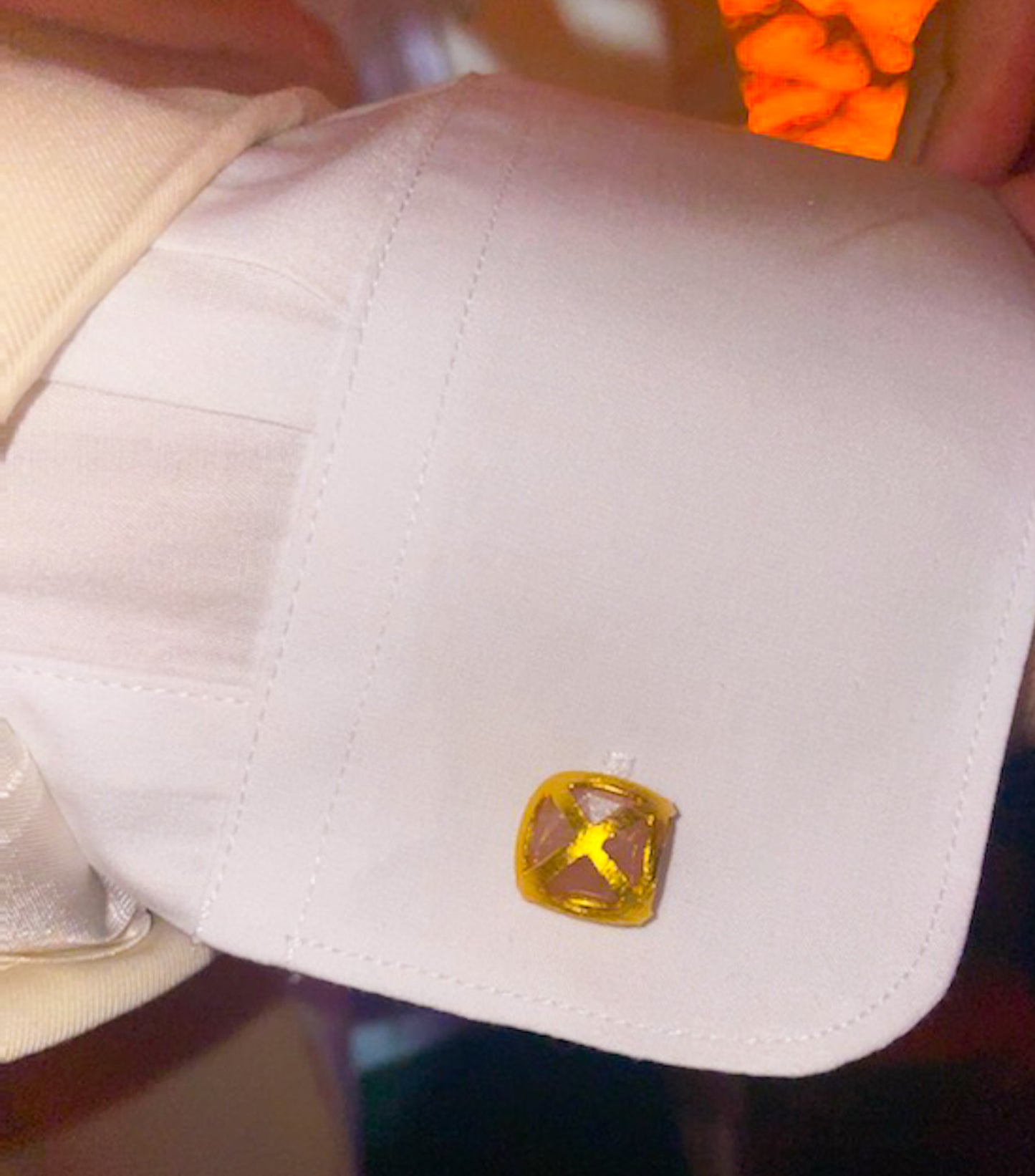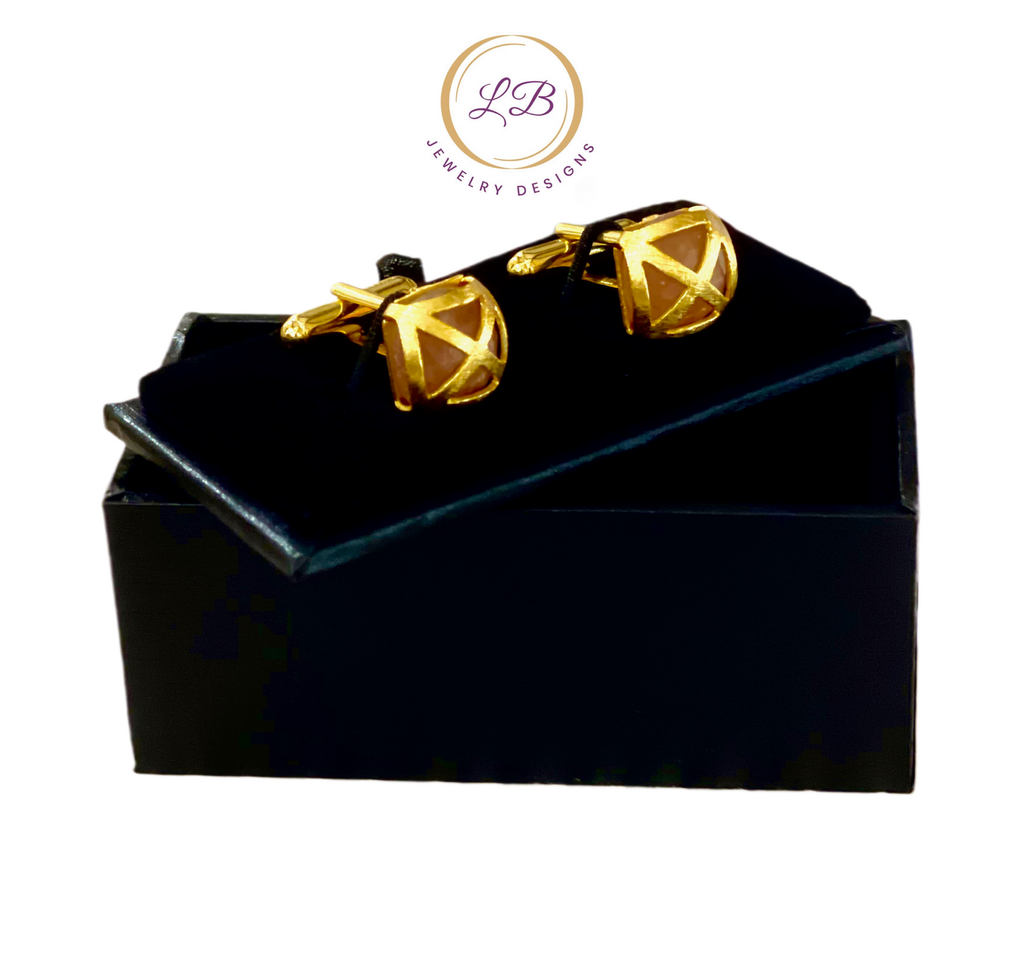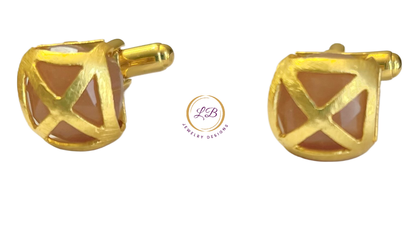 Elevate a tuxedo or dress shirt with these exclusive Orange Moonstone gemstones and 22k Gold Vermeil Gemstone Cufflinks w/Logo. Handcrafted with a unique brushed vermeil X design on the face, each piece is set with a genuine 10mm orange Moonstone gemstone. The backside is engraved with the LB Designs swirl logo for added distinction. Give the gift of tasteful style and show him your admiration of his discerning sophisticated style.