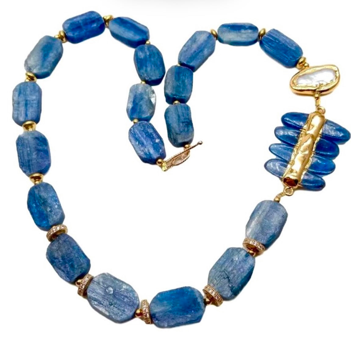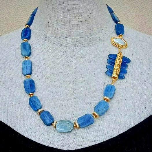 This 21” statement necklace boasts an alluring combination of Kyanite gemstones and gold pave beads, exquisitely finished with a captivating freshwater Biwa pearl and a Kyanite gold side pendant. The blue of the untreated, natural Kyanite resembling a light sapphire entices with its intensity - no wonder the stone's name derives from the Greek for "deep blue".