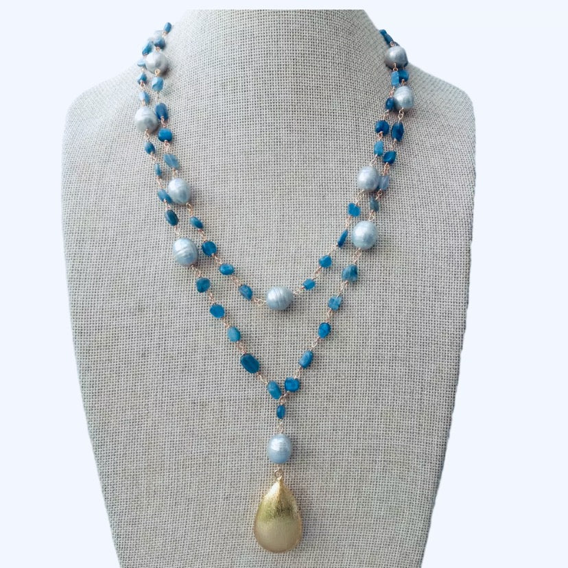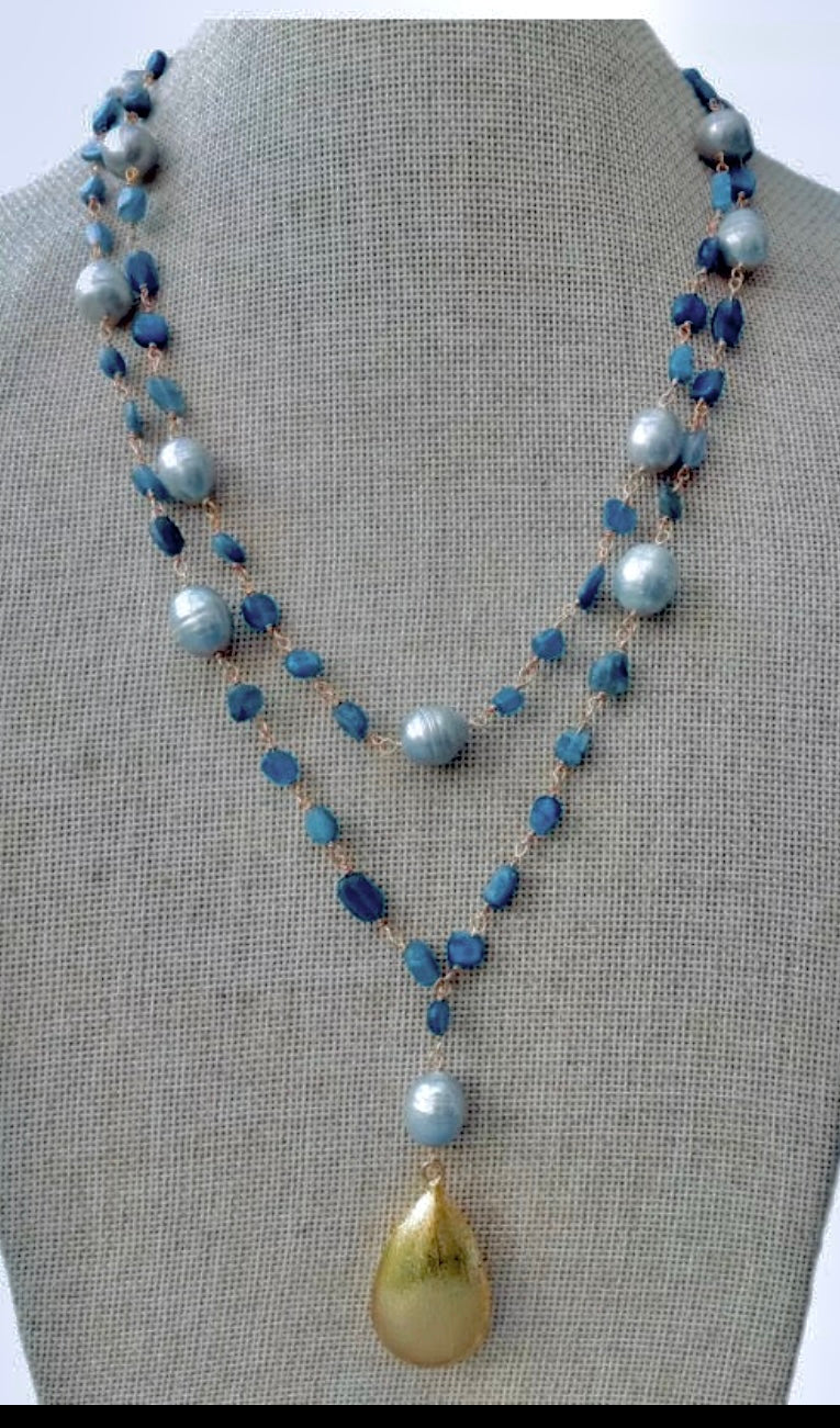 Natural Blue Kyanite and Pearl Statement Pendant Necklace