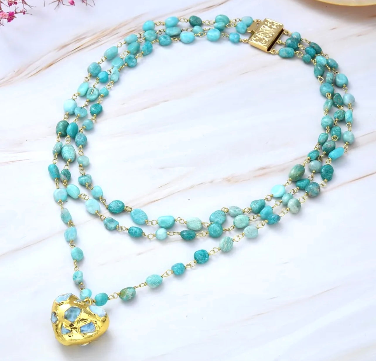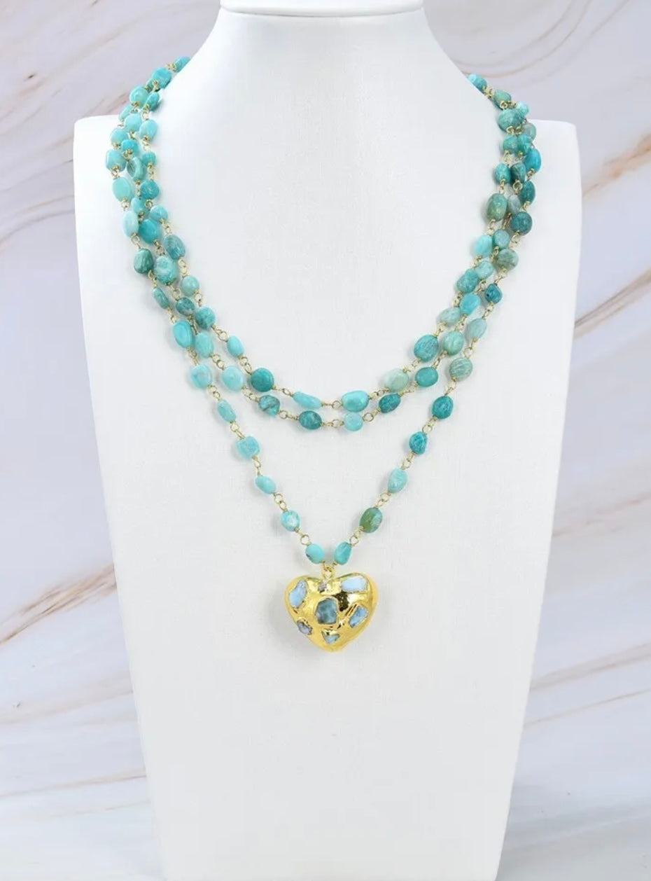 Triple-Strand Blue Larimar Gemstone Heart Pendant Necklace