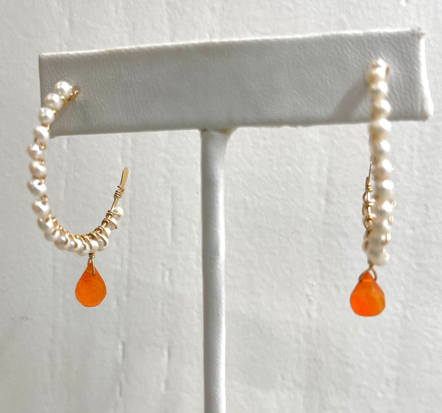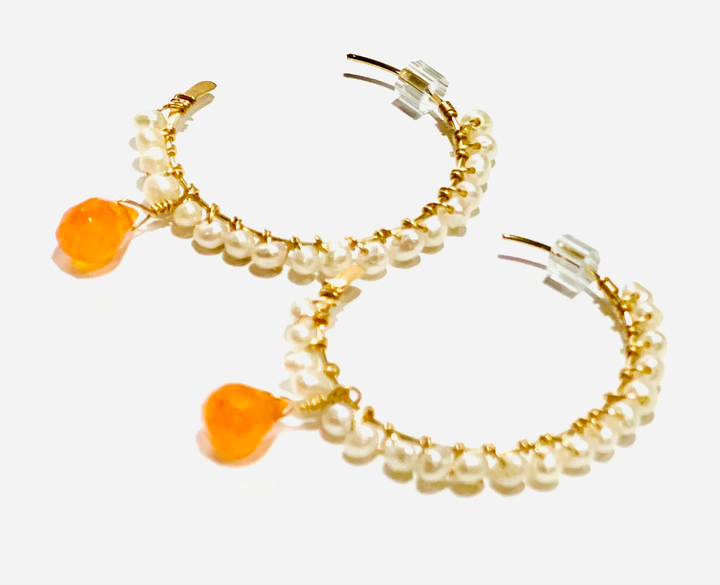 Lightweight Freshwater Pearls & Orange Carnelian Gemstone Gold Hoops