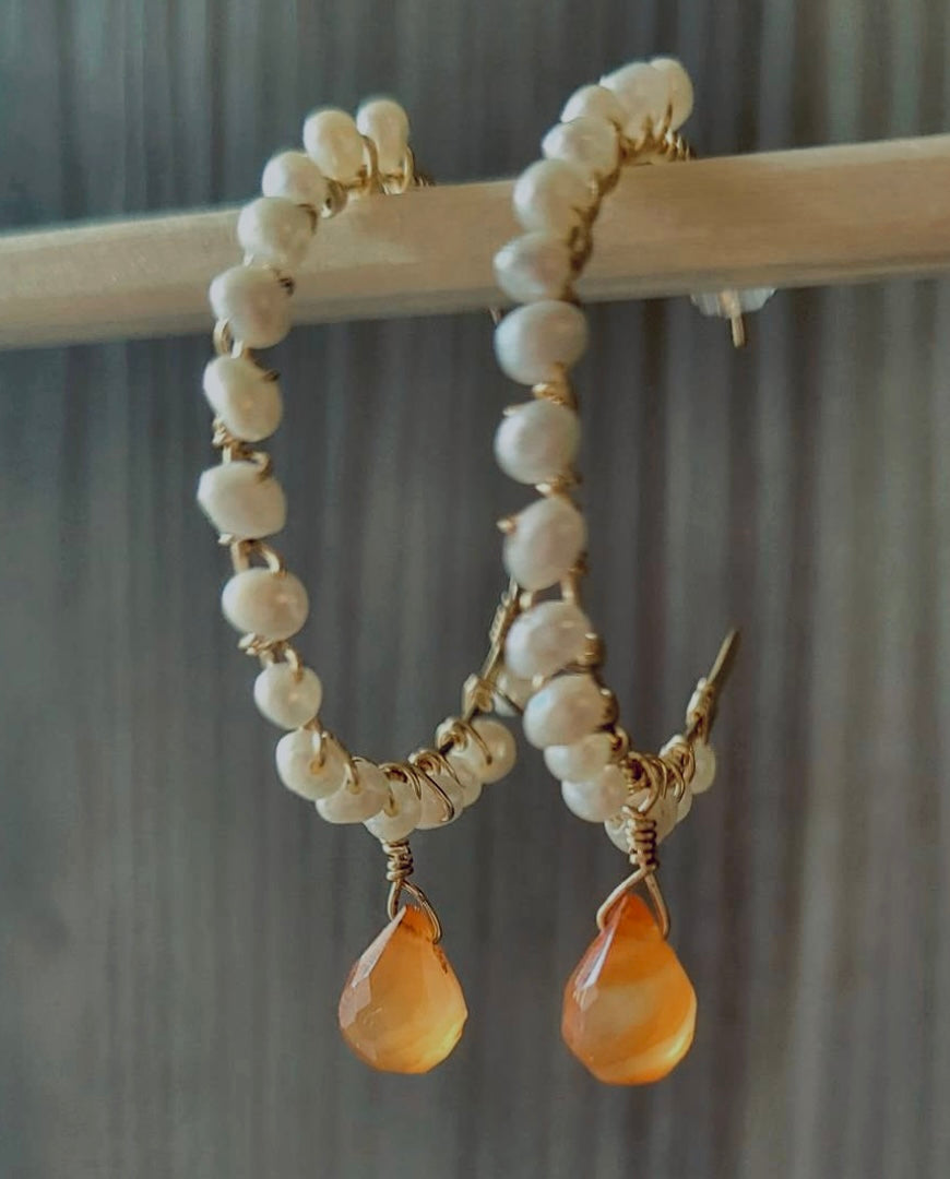 Designed with a classic 14k Gold Filled finish and a hammered edge, these earrings embody an effortless chic. Hand-wrapped with white freshwater pearls and a vibrant Orange Carnelian gemstone, these hoops exude an exclusive, timeless aesthetic. Perfect for the modern sophisticate, these 26mm gold-filled pieces boast unique, luxurious appeal.
