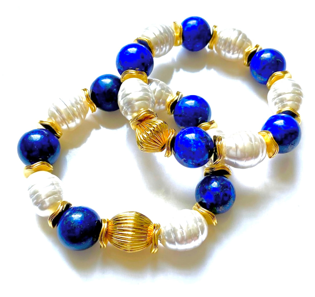 This 7" bracelet is a perfect year-round accessory for any outfit, featuring five 14mm white freshwater pearls, five 14mm Lapis Lazuli gemstones, and a sparkling 14mm, 24k gold-filled, corrugated center bead.