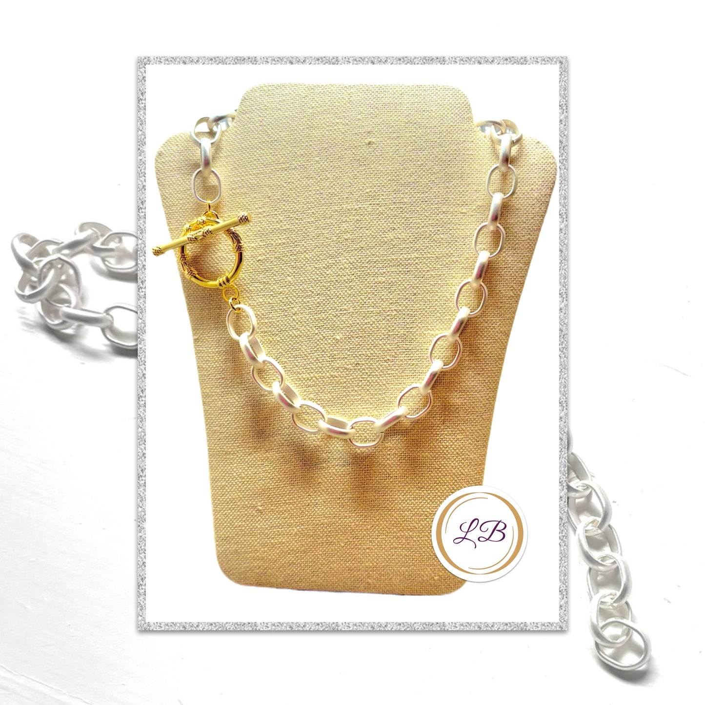 This 18" matte silver & gold Chunky Chain Necklace features a sleek and contemporary design, with chunky interlocking links for a bold look finished with 22k gold-plated, Bali-style toggle clasp with outer and inner ring sizes of 33mm and 22mm, and a bar measurement of 53mm.
