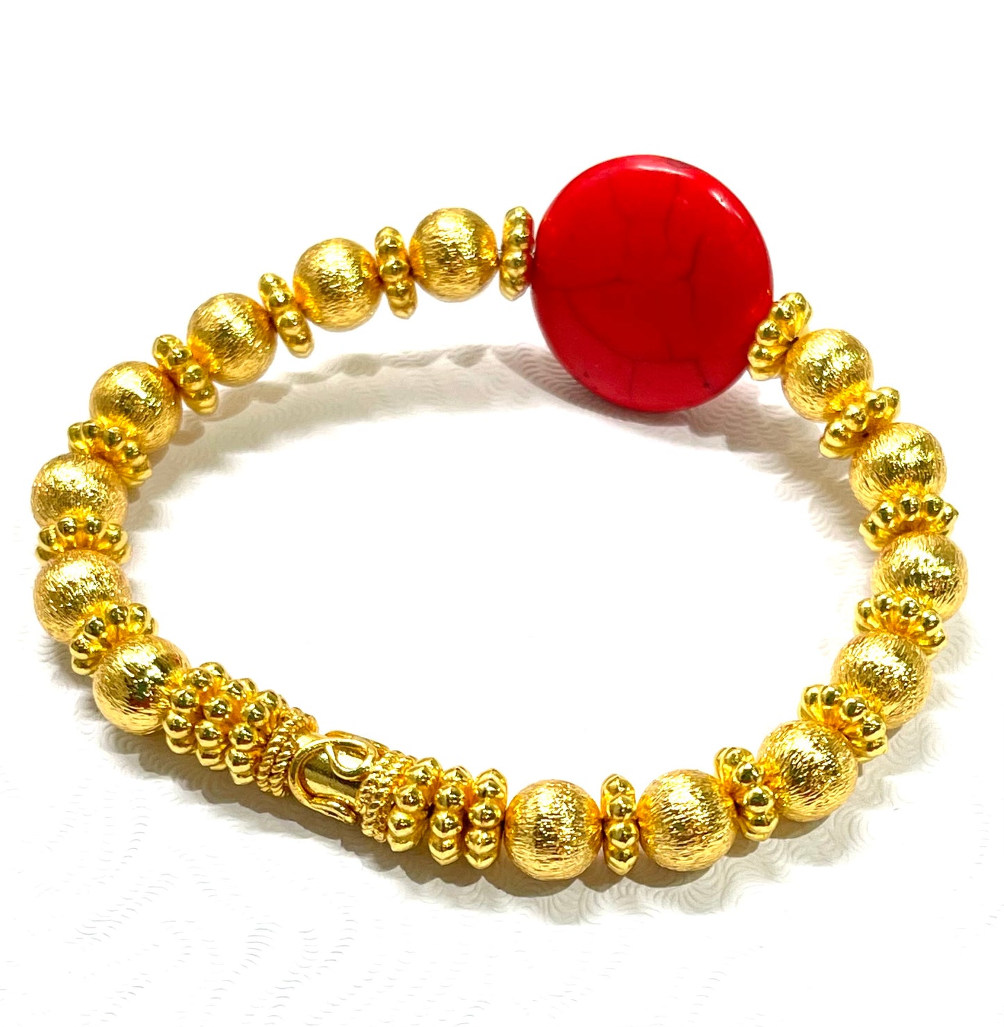 This 7" beaded bracelet features a classic design that is perfect for stacking or wearing alone. The centerpiece is a nickel-shaped red coral stone, accented by 18k brushed gold vermeil (gold plate) beads measuring 8mm. It is a must-have addition to any wardrobe, adding a touch of minimalistic elegance.