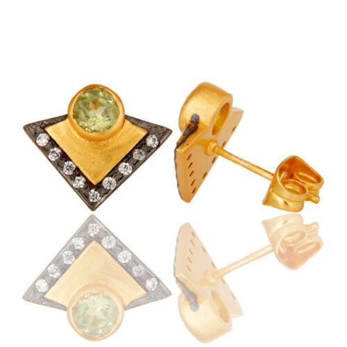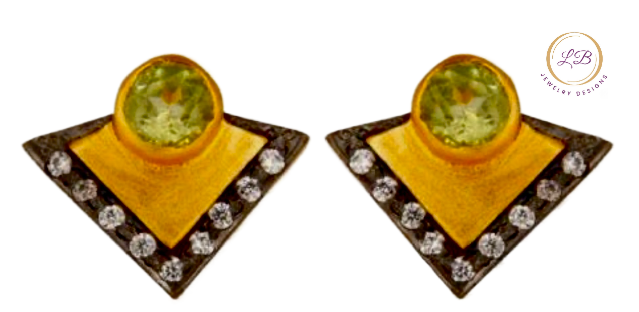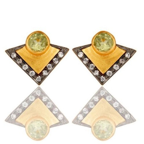 These modern and chic stud earrings are made with a center light yellowish-green Peridot semi-precious gemstone, 22k gold vermeil and cz accents in black rhodium. These are small and elegant studs.
