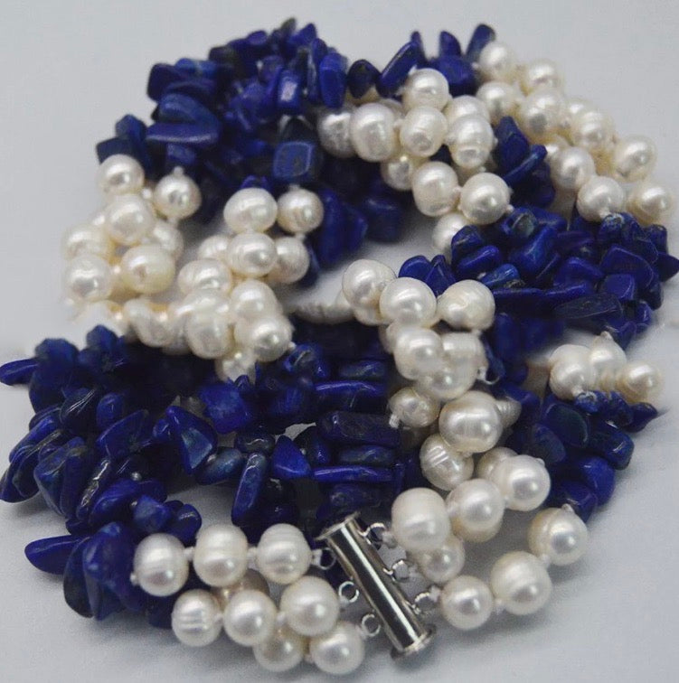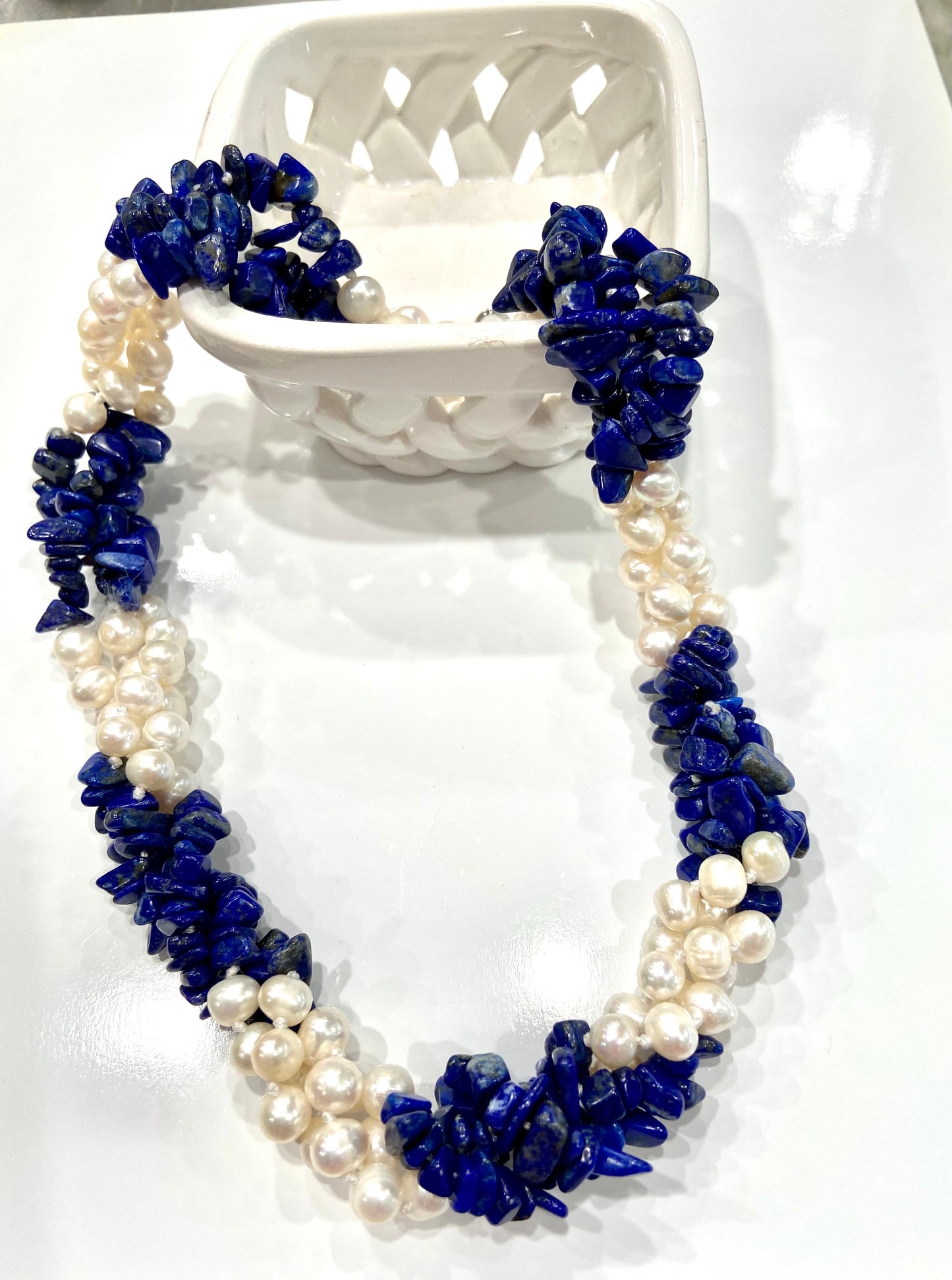 Lapis Lazuli & Freshwater Pearls Gemstone Triple-Strand Statement Necklace 18"