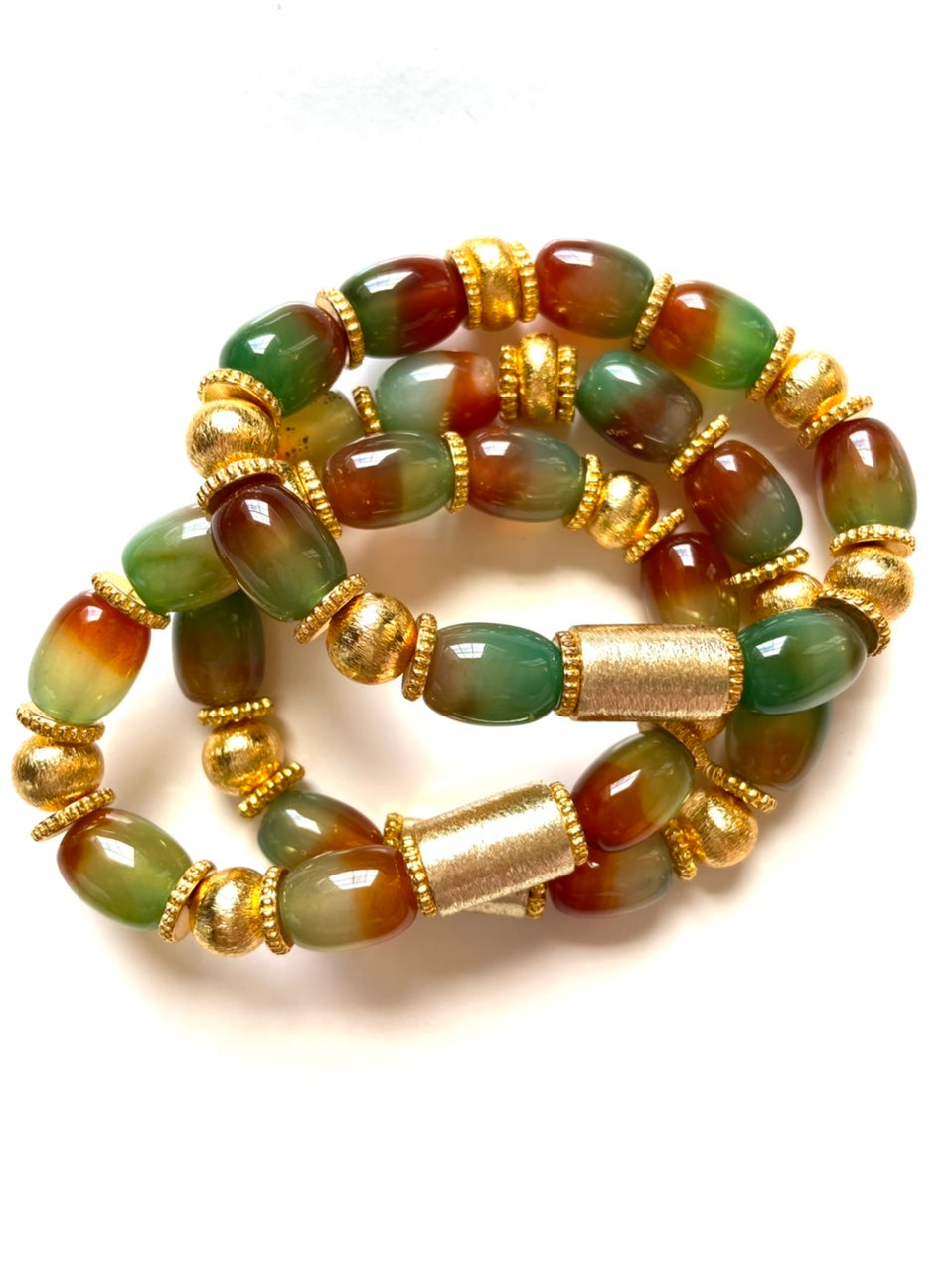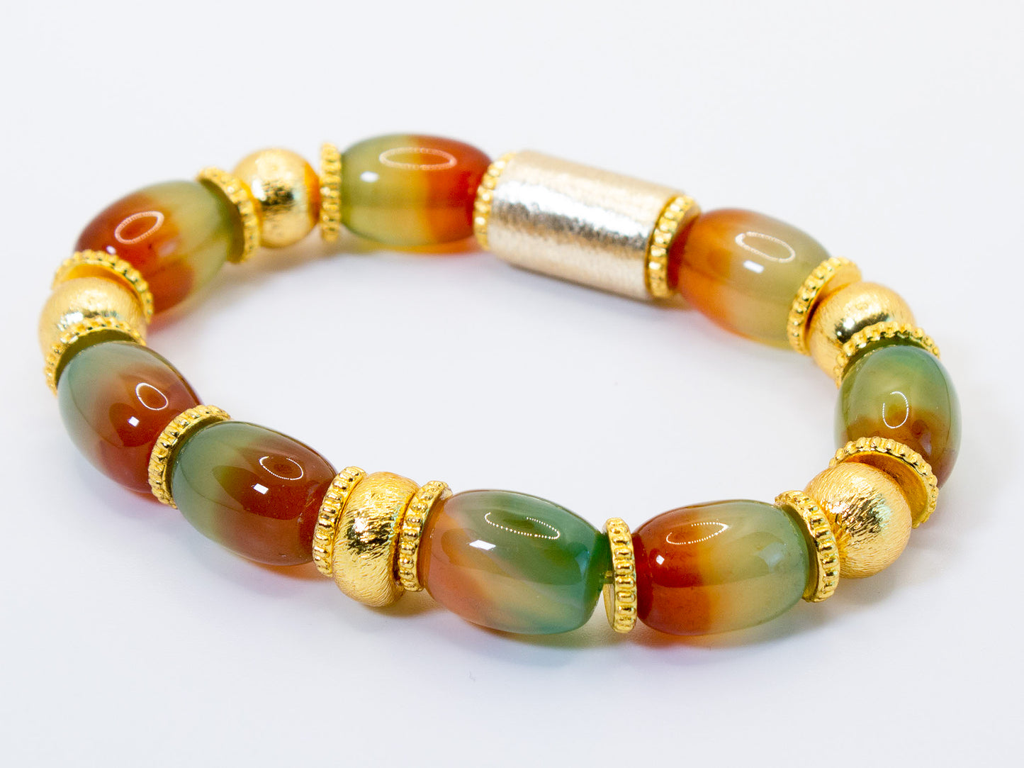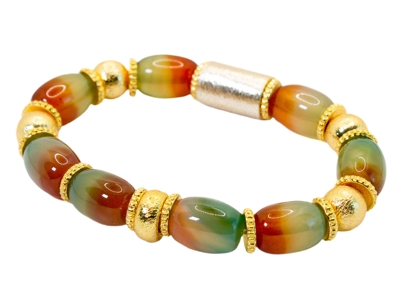 This bracelet is expertly crafted with stunning Onyx Agate gemstones (13 x 18mm) in a column shape, providing versatility and beauty all year round. It features a 14k brushed gold vermeil cylinder and accent beads, showcasing shades of green, orange, and deep red.