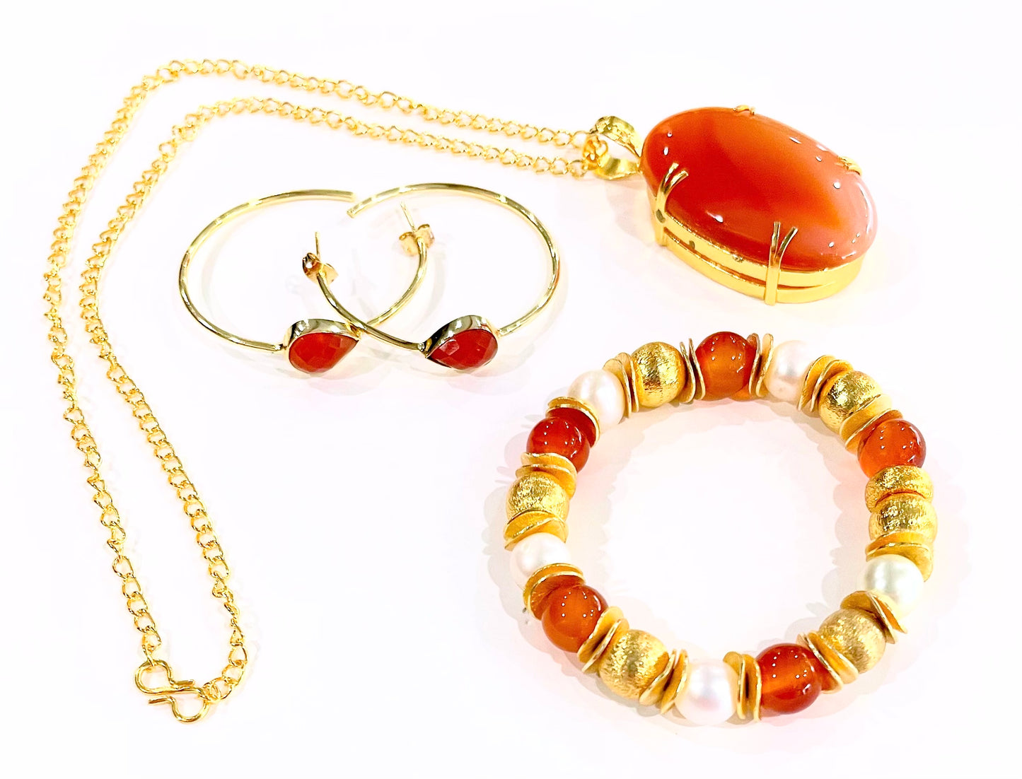Orange Carnelian Pendant Necklace, Bracelet and Hoops Three-Piece Set