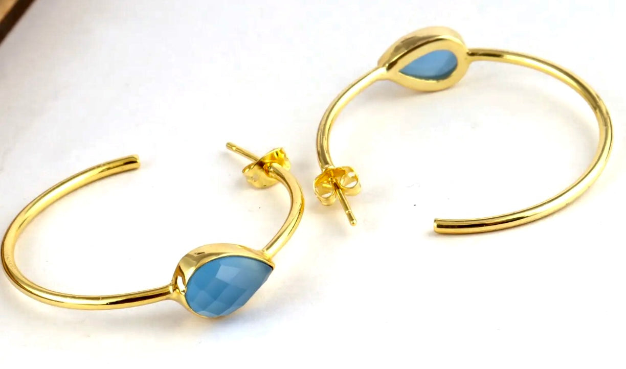 These 2.25 inch hoop earrings are crafted with precision and feature gorgeous pear-shaped blue Aquamarine gemstones, all plated in 18k gold over brass. Add a touch of elegance to any outfit with these exquisite statement pieces.