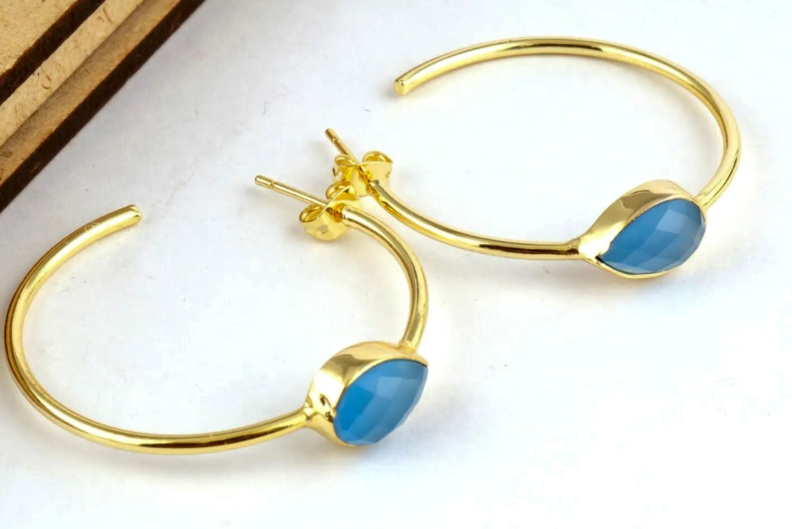Pear-Shaped Blue Aquamarine Gemstone Hoop Earrings 2.25”