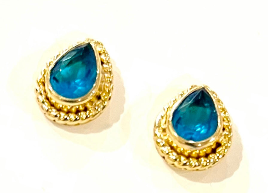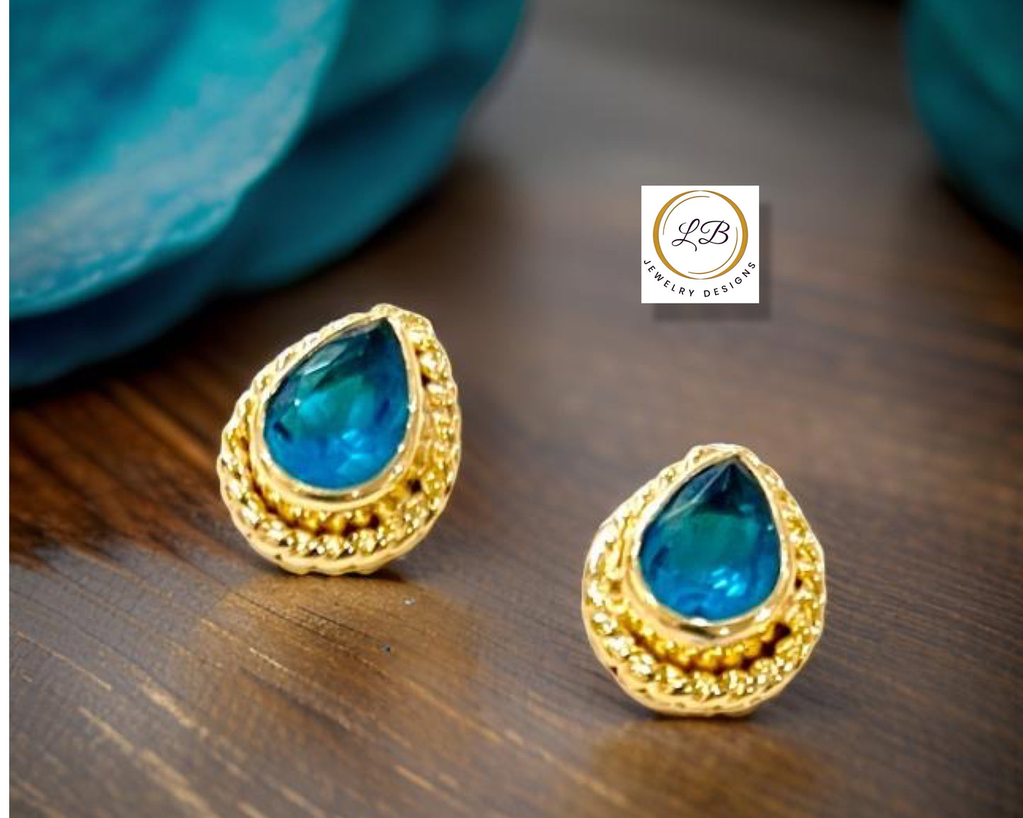 These 14k gold plated stud earrings feature a sophisticated twisted rope design and showcase teardrop-shaped Blue Chalcedony stones, measuring 0.39" in diameter. Ideal for any occasion, these minimalist earrings are perfect year-round.