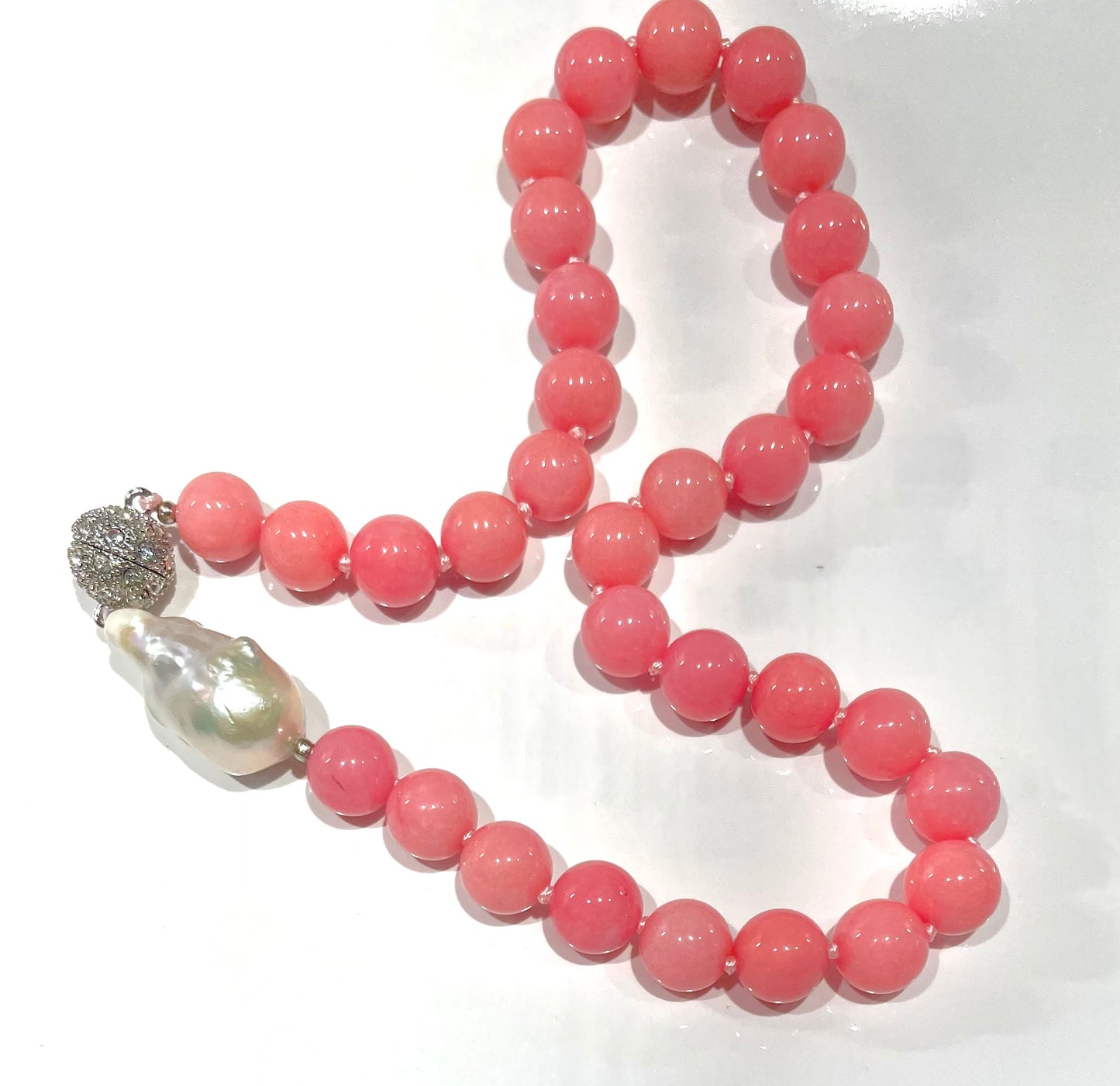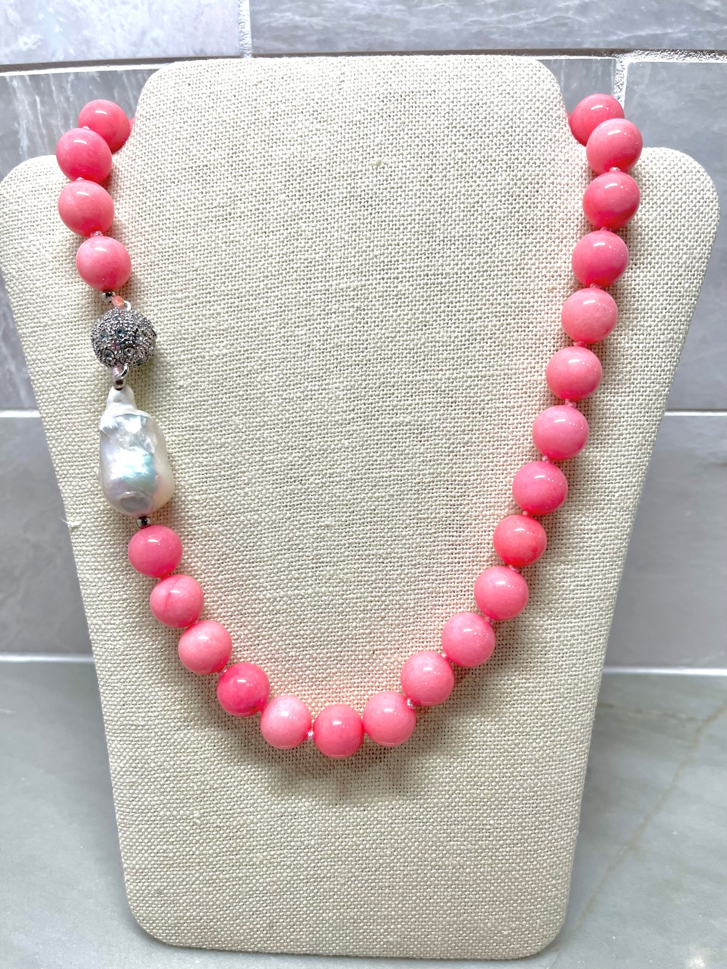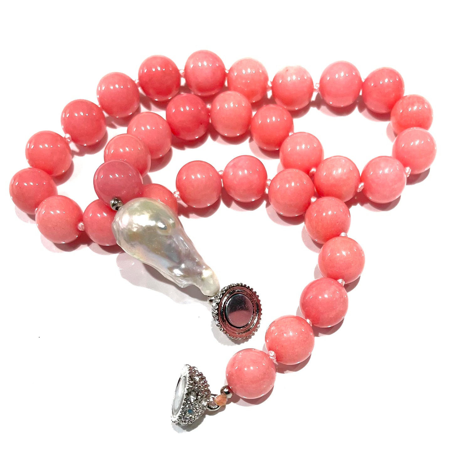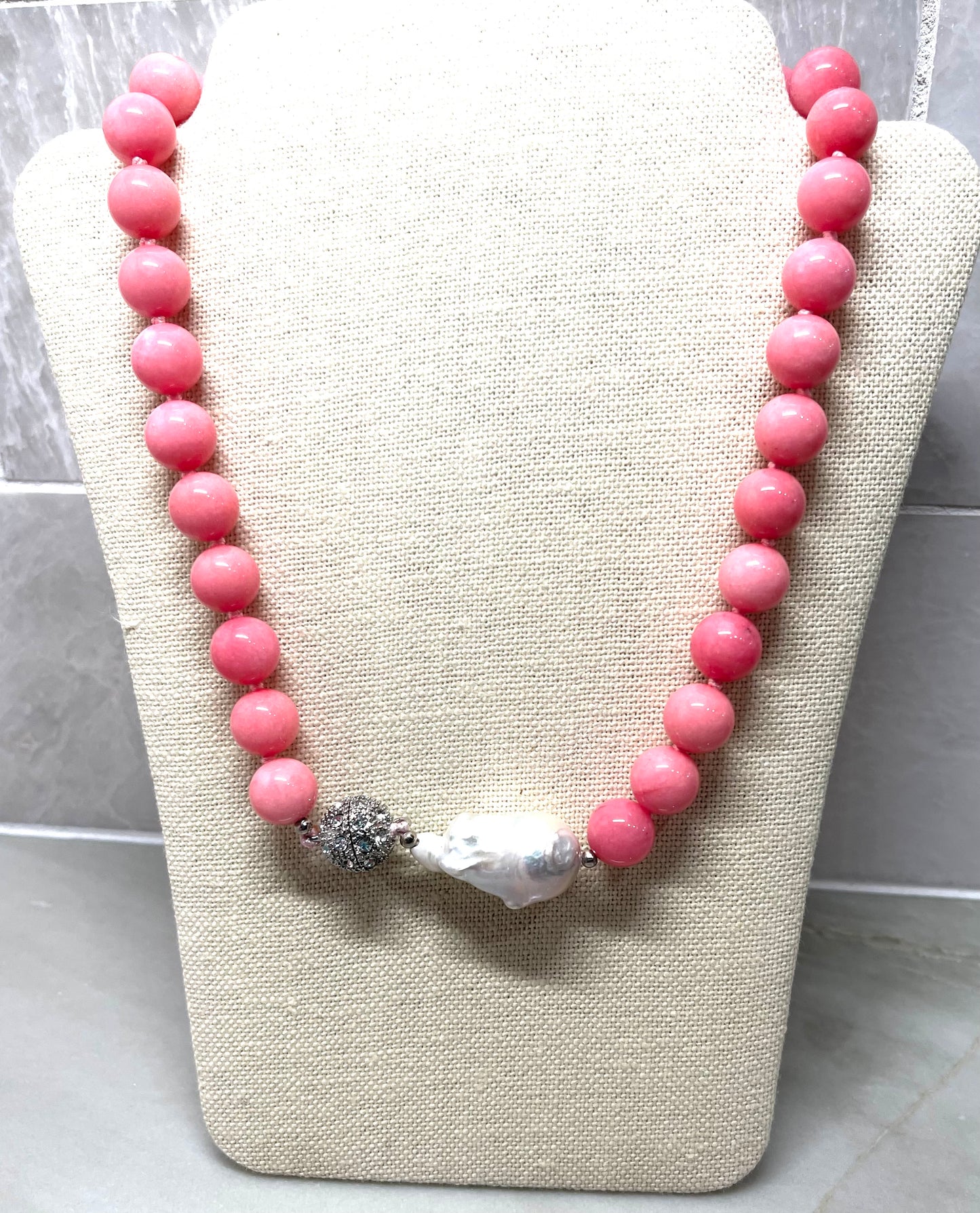 This gorgeous and unique Statement Necklace features a stunning combination of a large baroque freshwater keshi pearl and genuine pink Rhodochrosite gemstones, with a strong magnetic clasp fastening, all double-knotted with silk thread. With a magnetic clasp, it's easy to never worry about complicated clasps to put it on. Let the magnetic clasp do the work for you! Large imperfect, white baroque Keshi Pearl is 22mm x 30mm and the pink Rhodochrosite gemstones are 12mm.