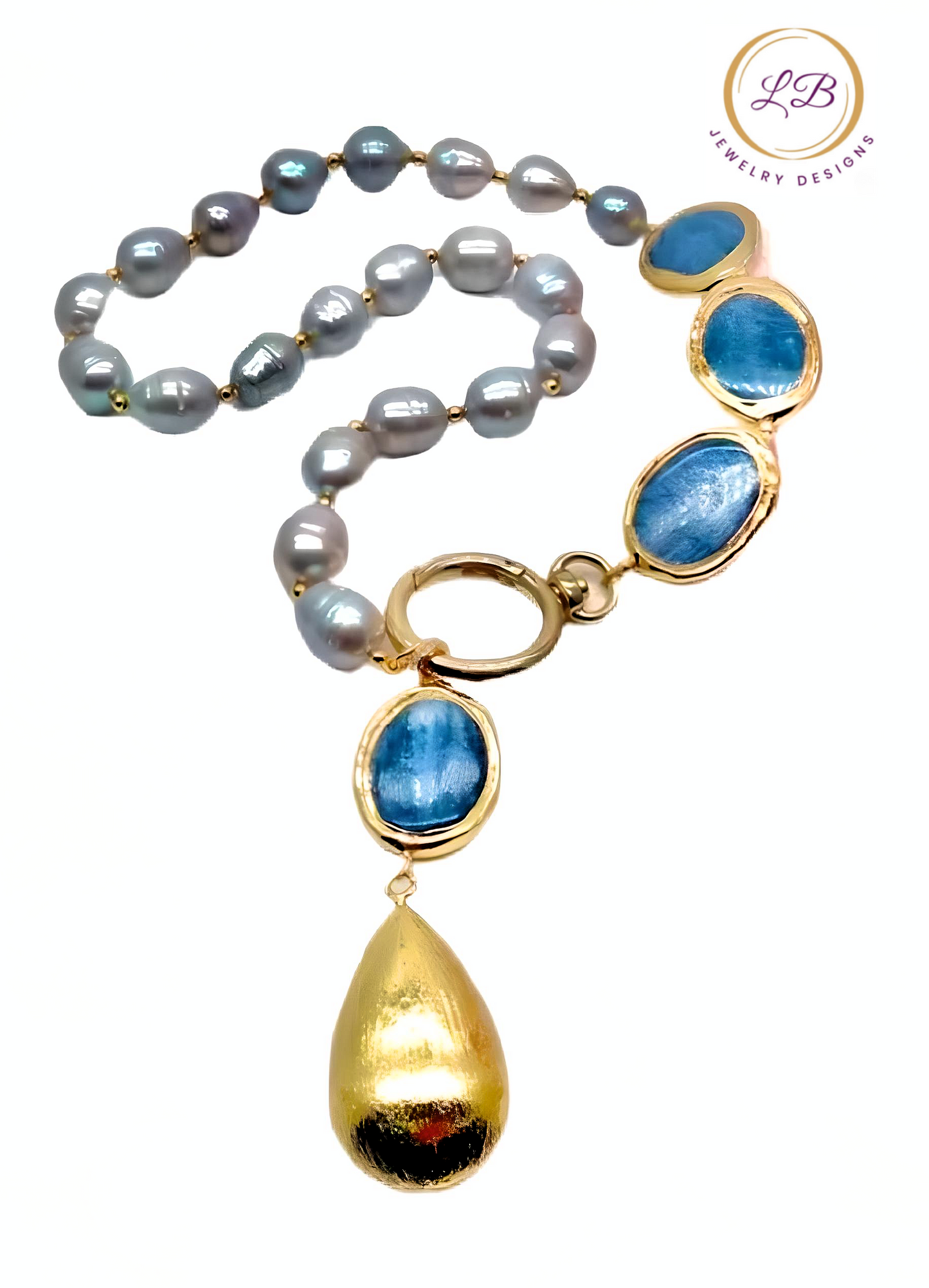 The Blue Kyanite and Gray Pearl Gemstone Necklace boasts an exquisite design featuring elegant gold vermeil accents, delicate gray pearls, and vibrant blue kyanite gemstones on a 22k gold plated chain. The statement piece is completed with a brush gold vermeil teardrop pendant and measures 18" in length.