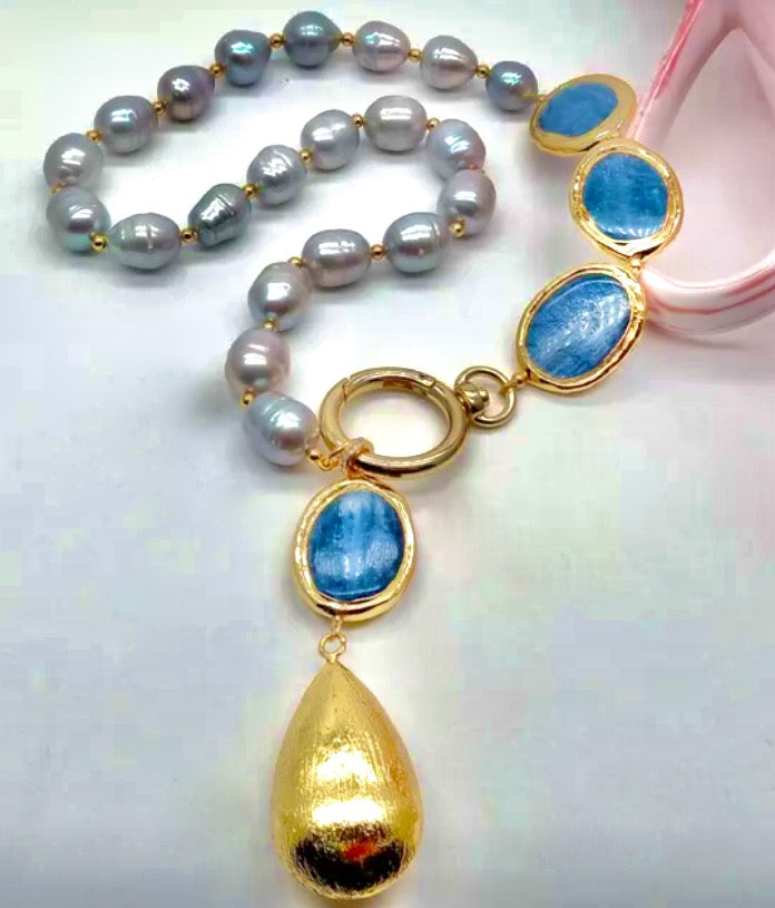 Blue Kyanite and Gray Pearl Gemstone Brushed Gold Vermeil Statement Necklace 18"