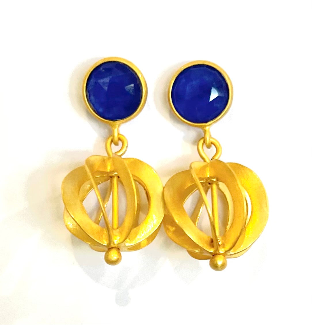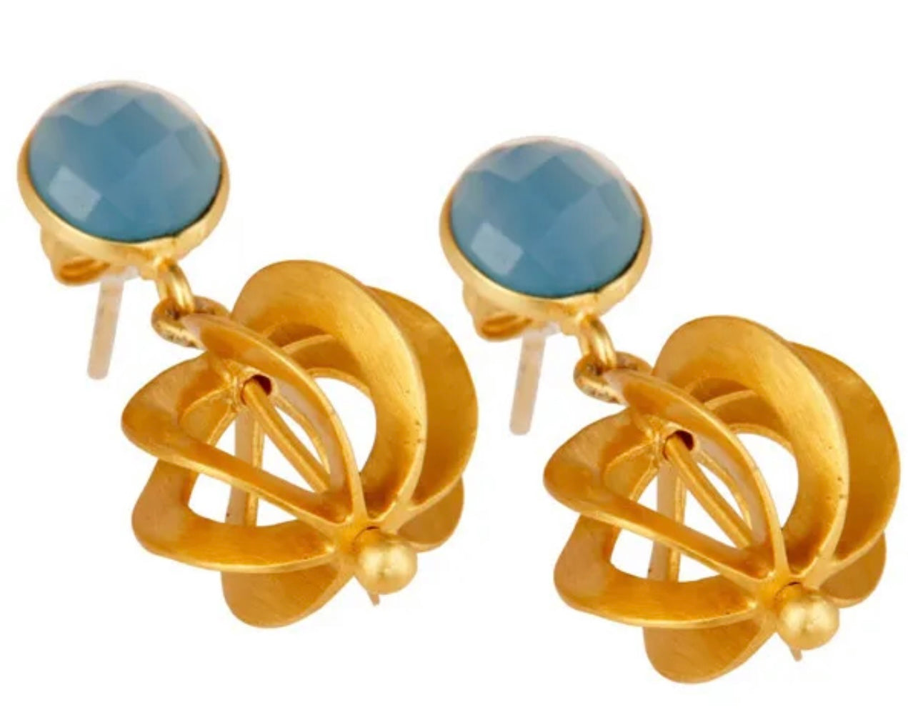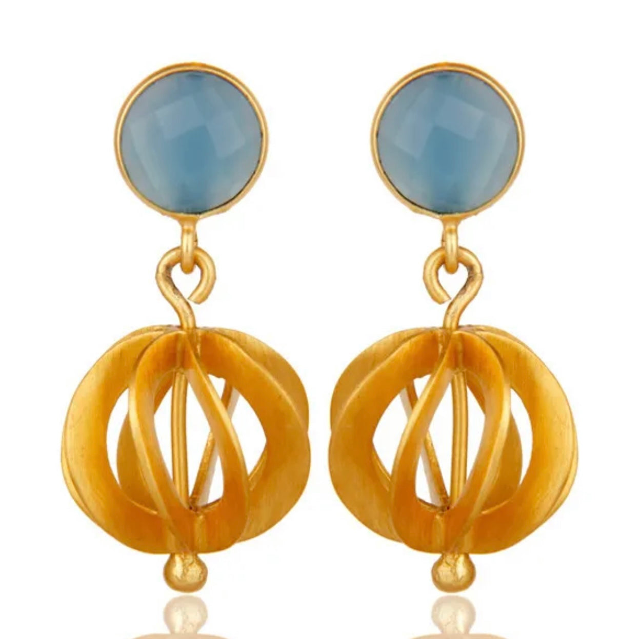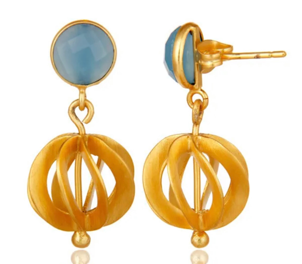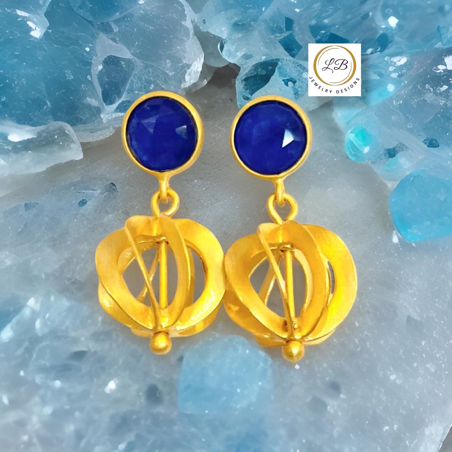 These earrings showcase a lovely Admiral blue Chalcedony gemstone studs adorned with 24k gold plated vermeil swirl filigree dangles, creating a stunning pair.