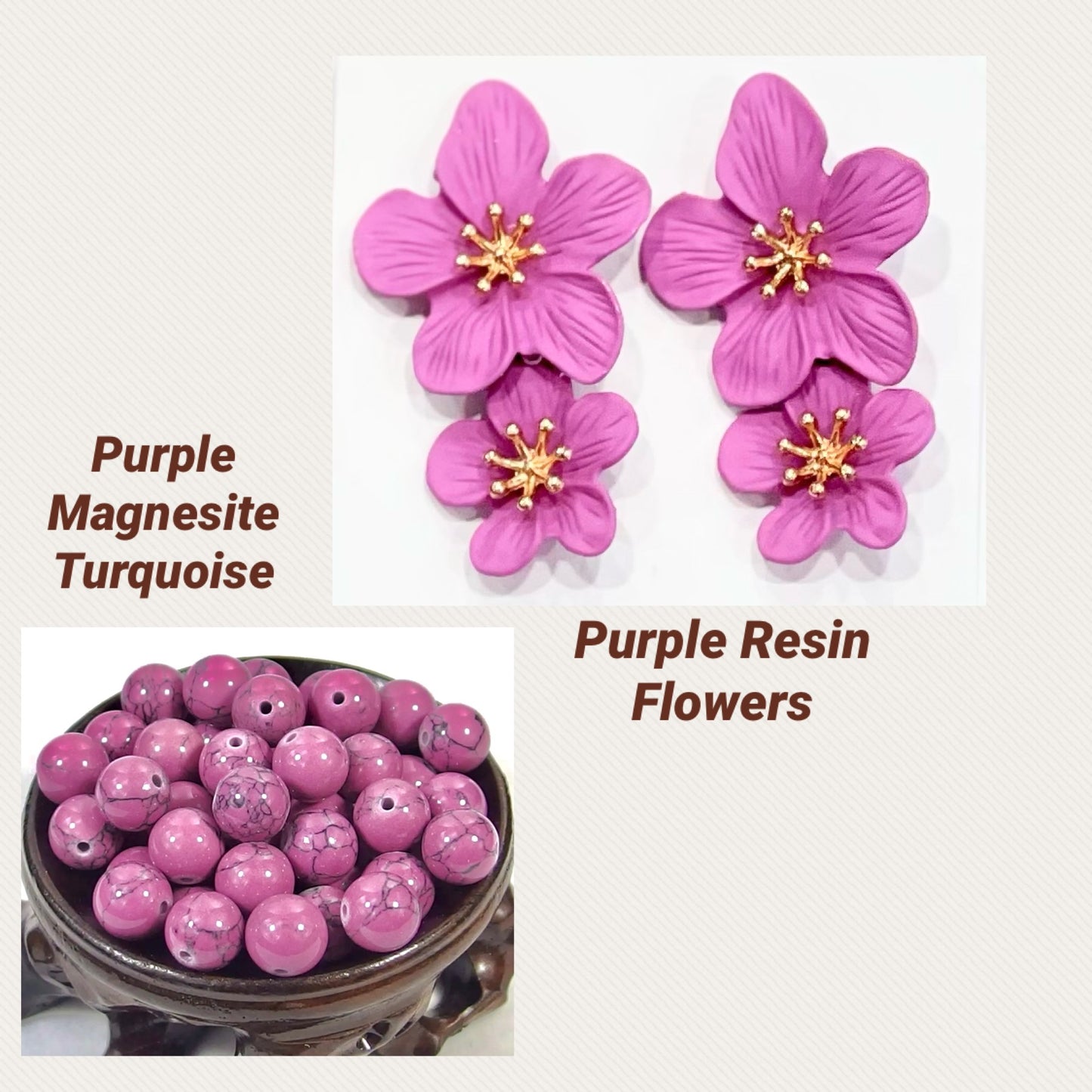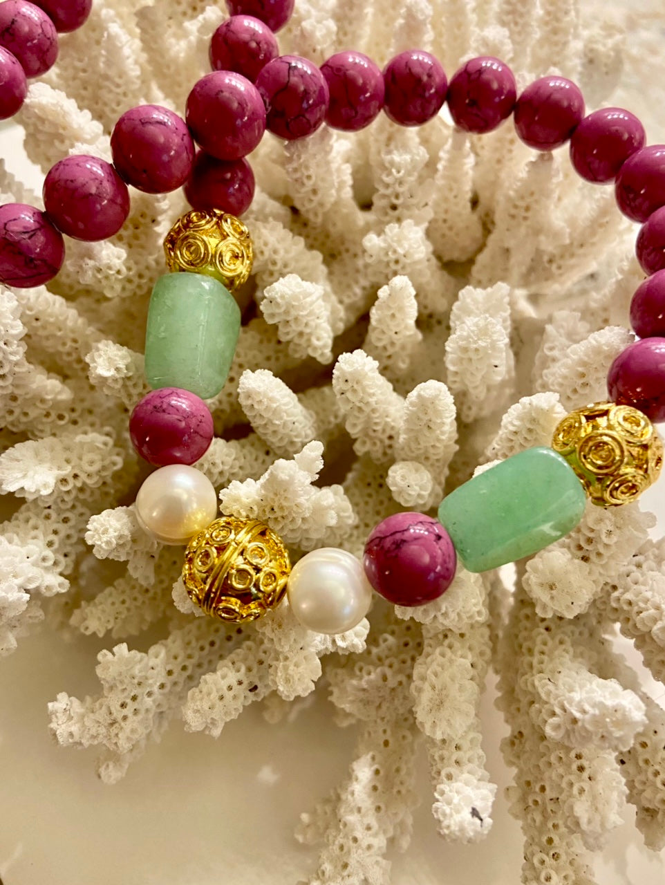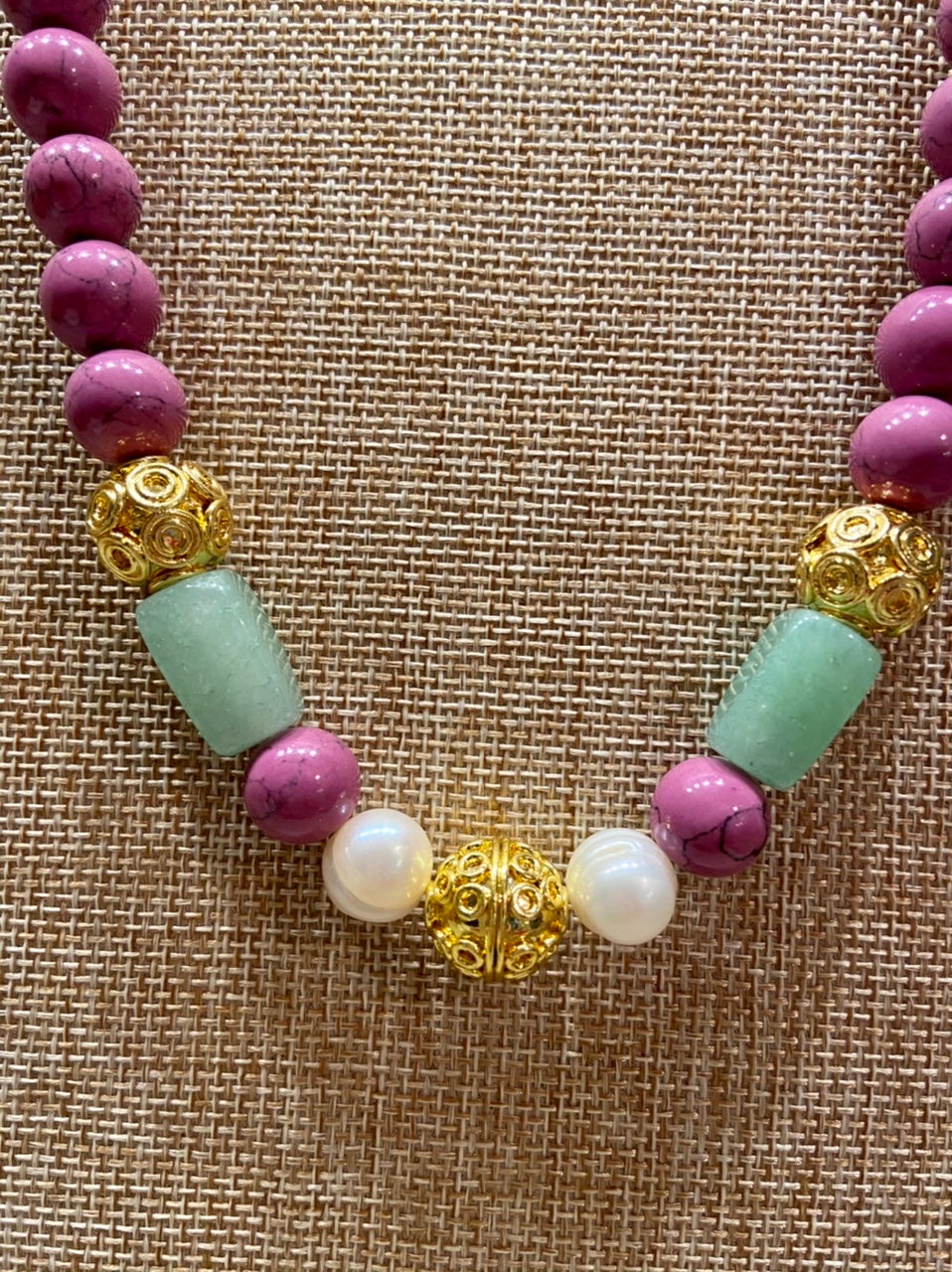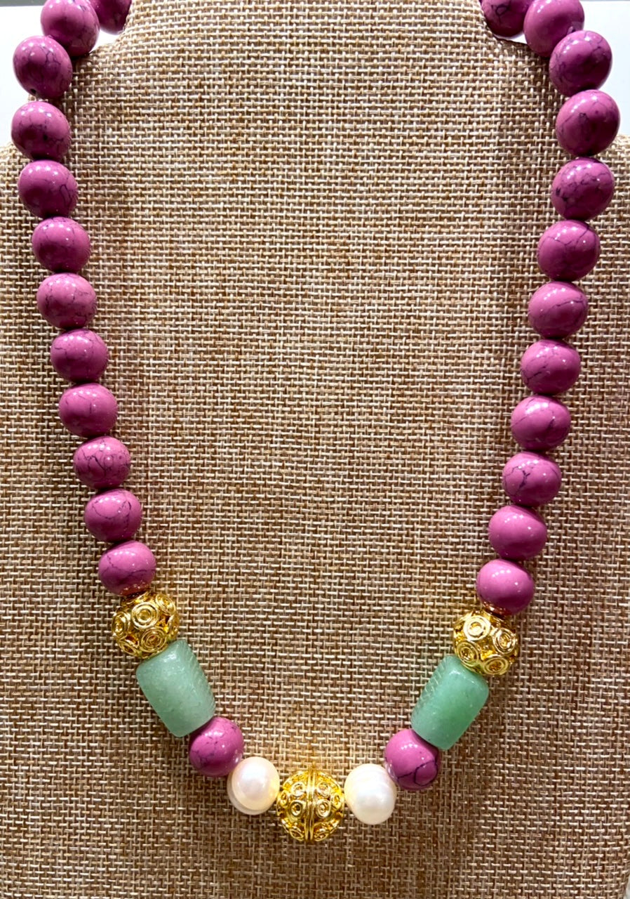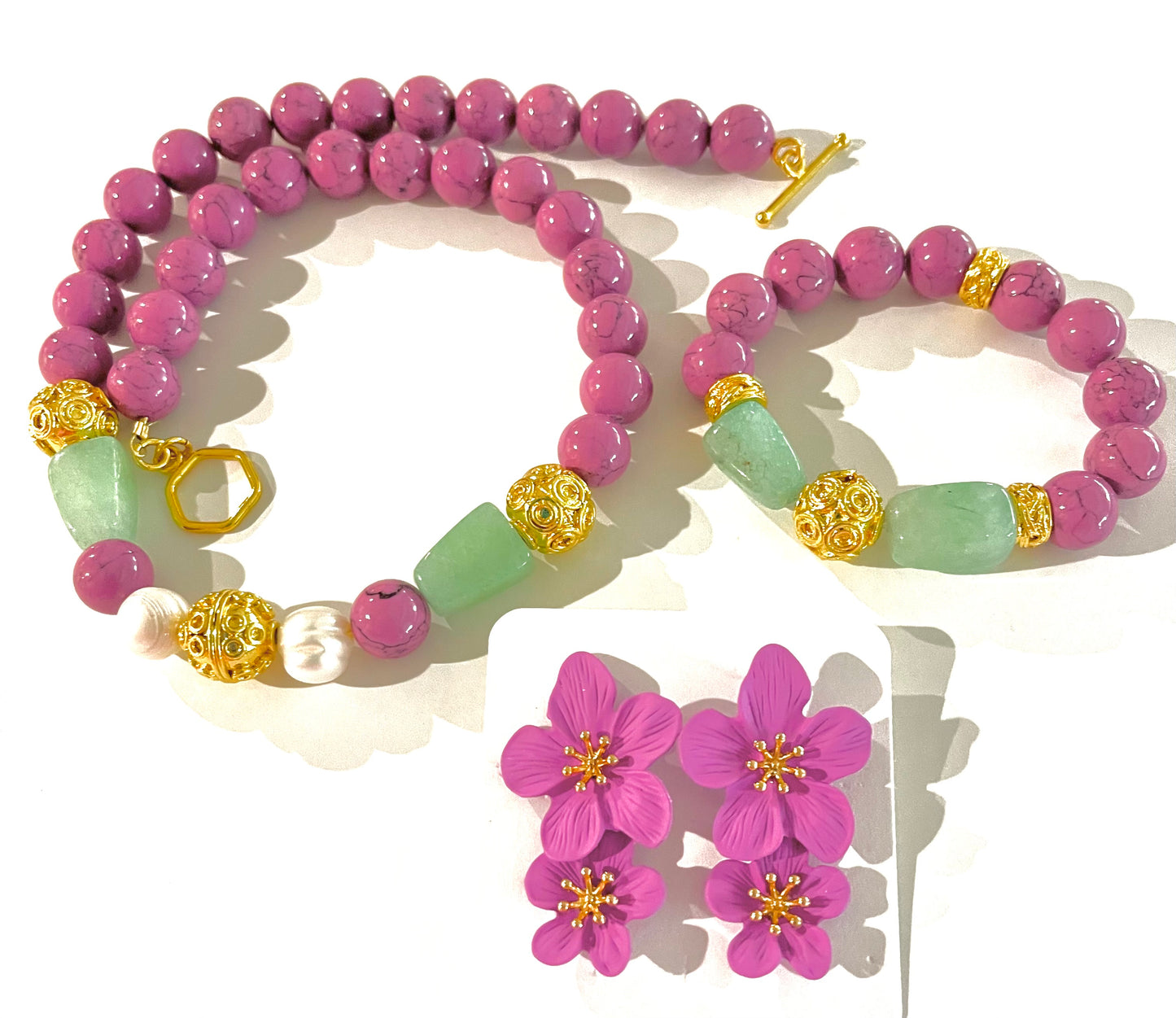Purple Turquoise, Green Aventurine and Freshwater Pearl Gemstone Statement Necklace, Bracelet, Earrings Set