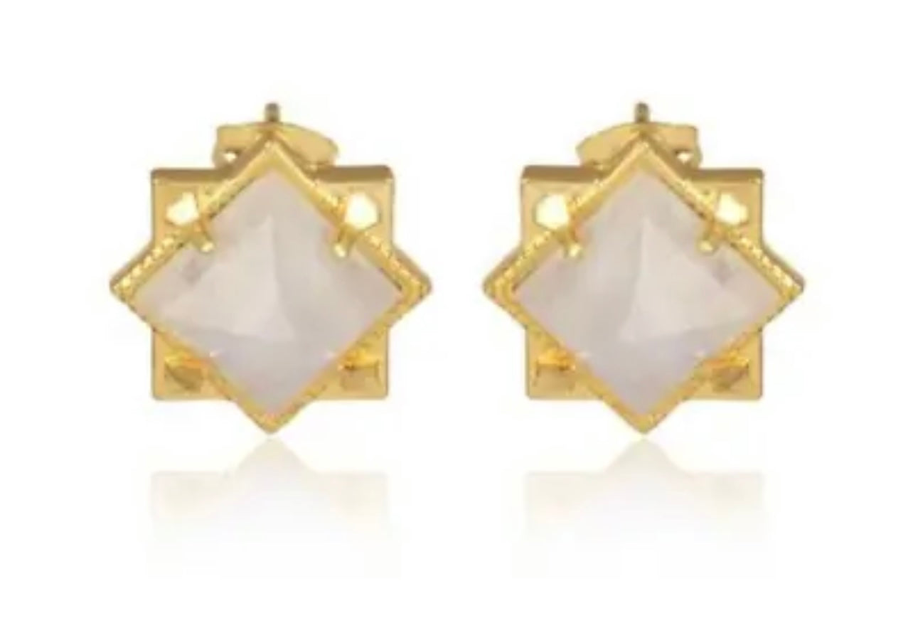 Expertly crafted with diamond-cut, square pyramid-shaped white Moonstone (10mm) gemstones & 24k gold vermeil, these earrings make a beautiful and elegant addition to any jewelry collection.