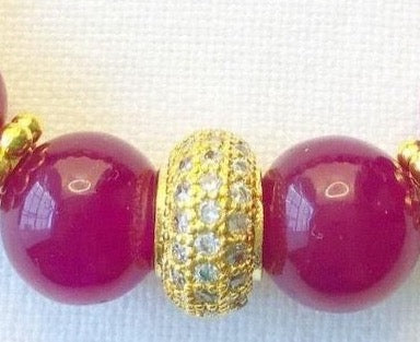 This 7” bracelet was designed with 14mm Rose Ruby Quartz gemstones, gold vermeil spacers and a lovely gold micro pave center bead.