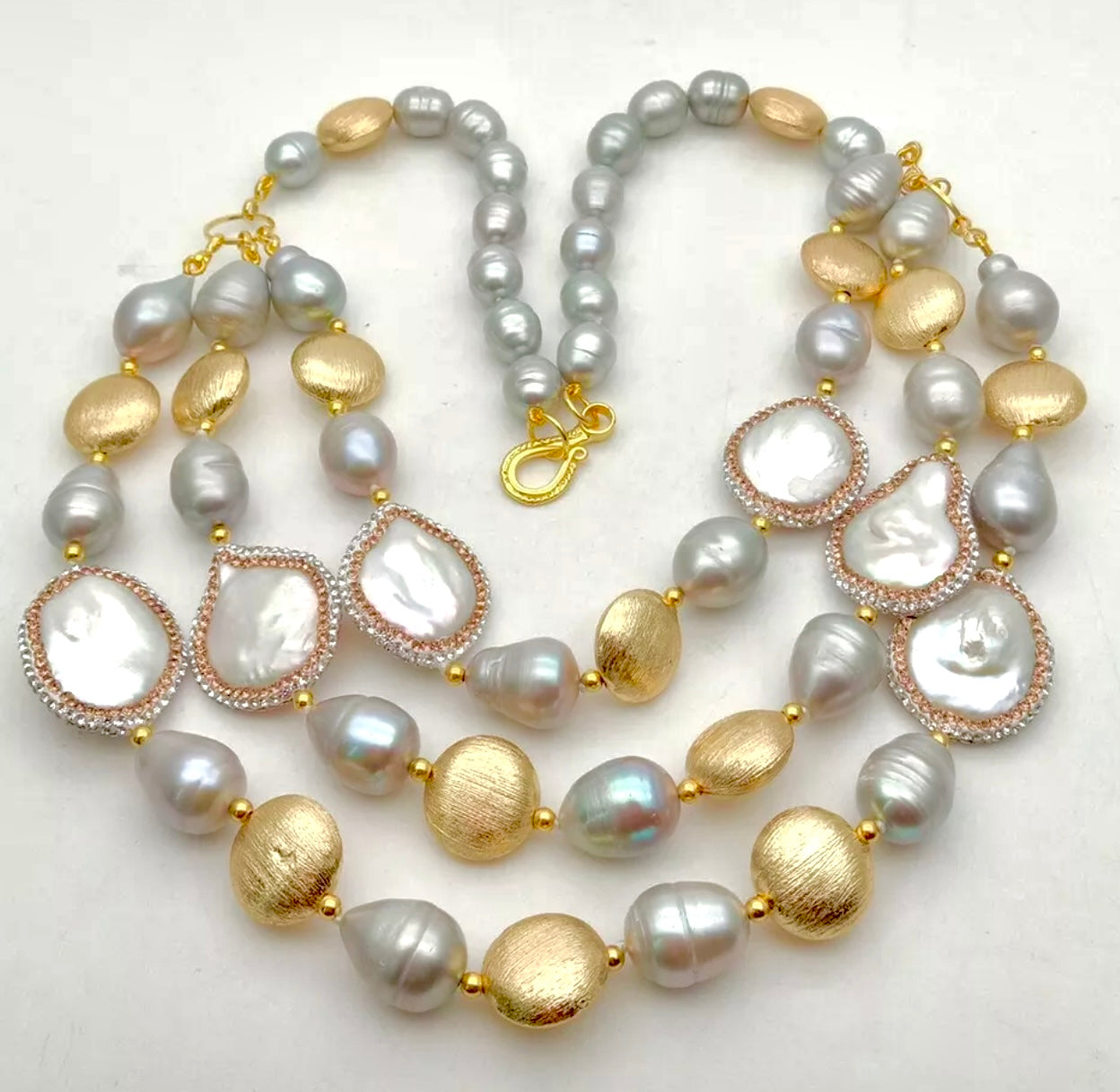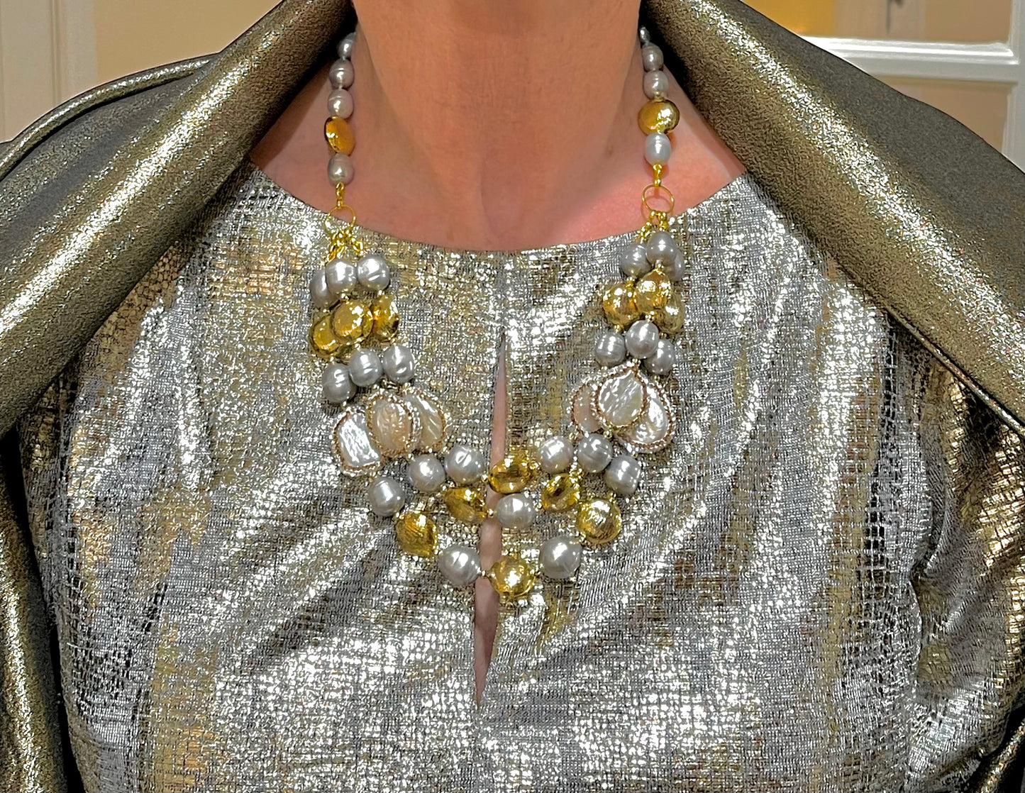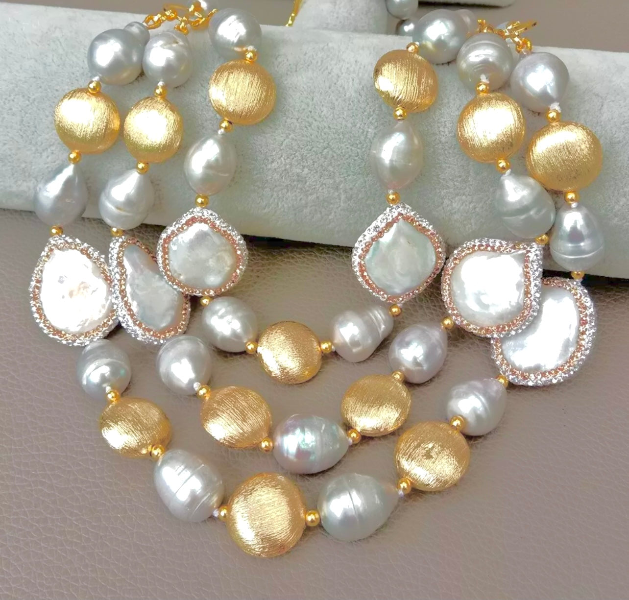 Discover the elegance of this adjustable Statement Necklace, incorporating three strands of 18k brushed gold vermeil beads and authentic pearls. With each strand meticulously constructed with baroque pearls, coin pearls adorned with Marcasite stones, and 18k brushed gold vermeil beads, this necklace exudes sophistication. The length can be easily adjusted from 20" to 23", and its versatile design allows for three unique ways to wear it.