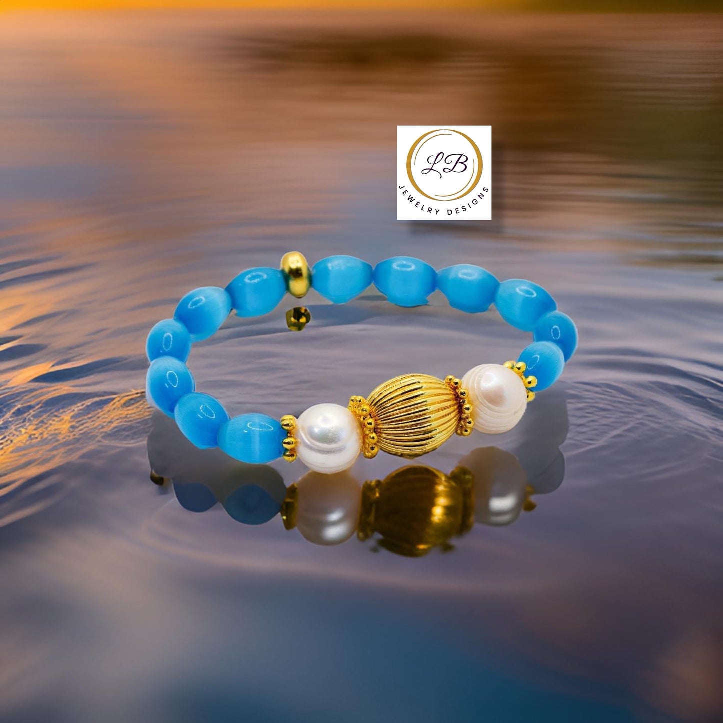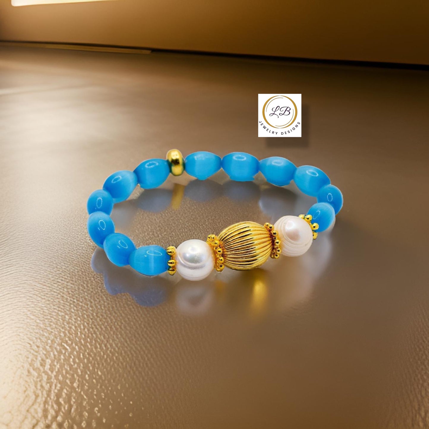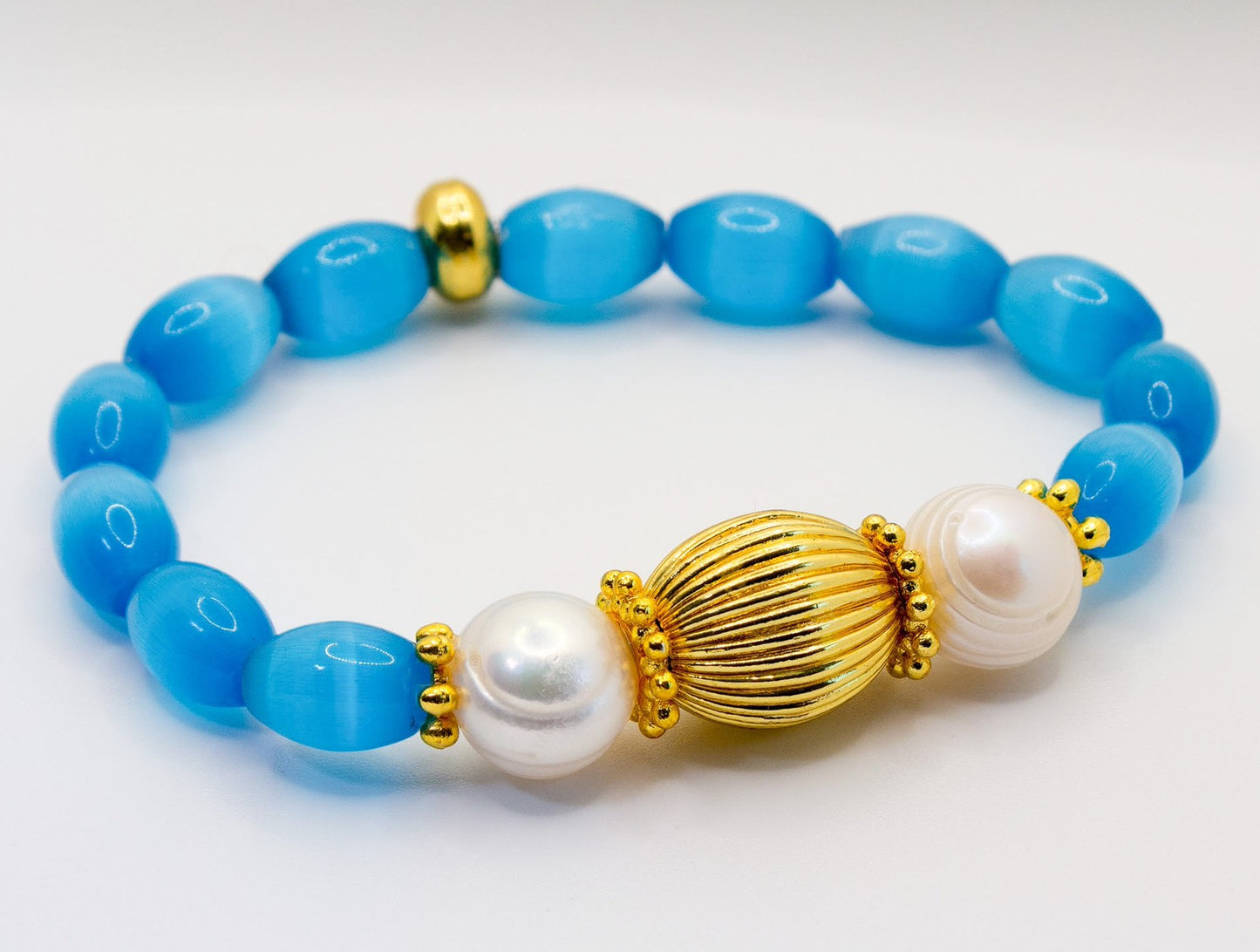 Blue Mexican Fire Opal Gemstone Beaded Bracelet, 18k Gold-Filled Center Bead and Baroque Pearls