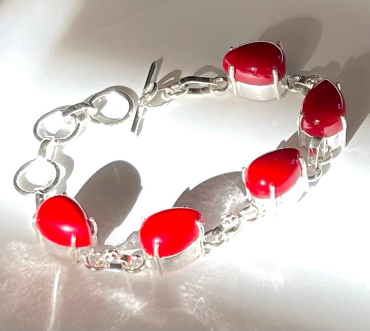 This lovely ensemble is handmade with bright red Italian Coral tear-shaped 10mm gemstones. The gemstones are prong set in .925 sterling silver on a cable chain bracelet. Adjustable 7"-8" The matching gemstone stud earrings are approximately 1".