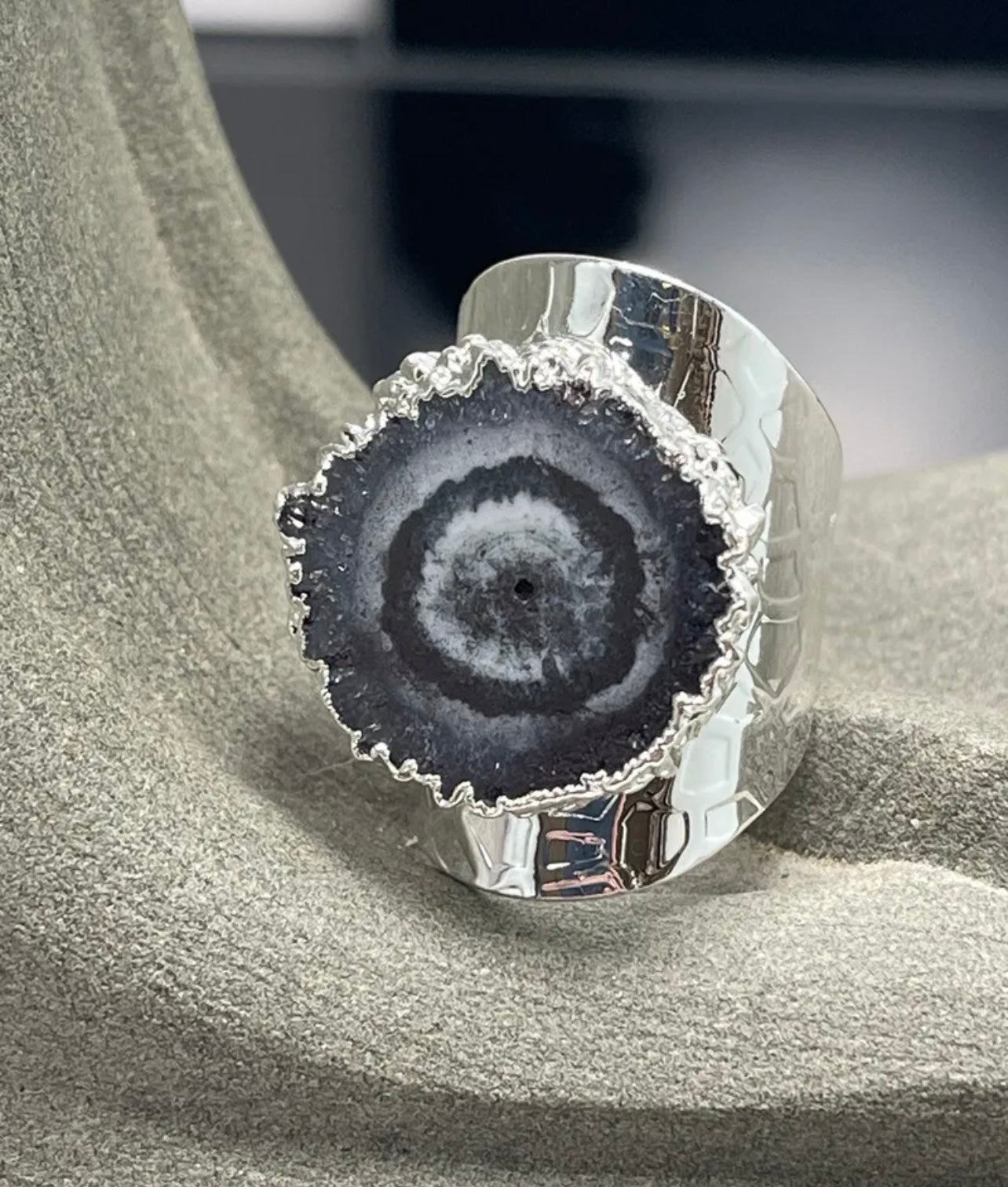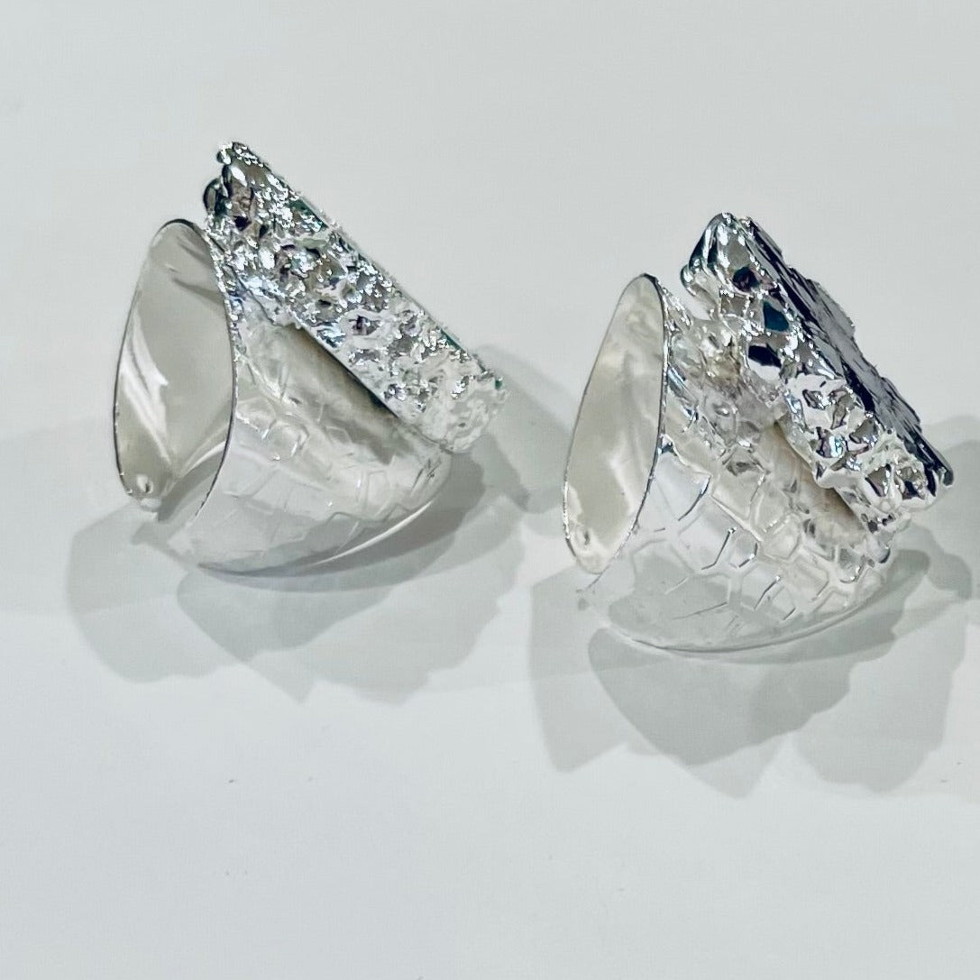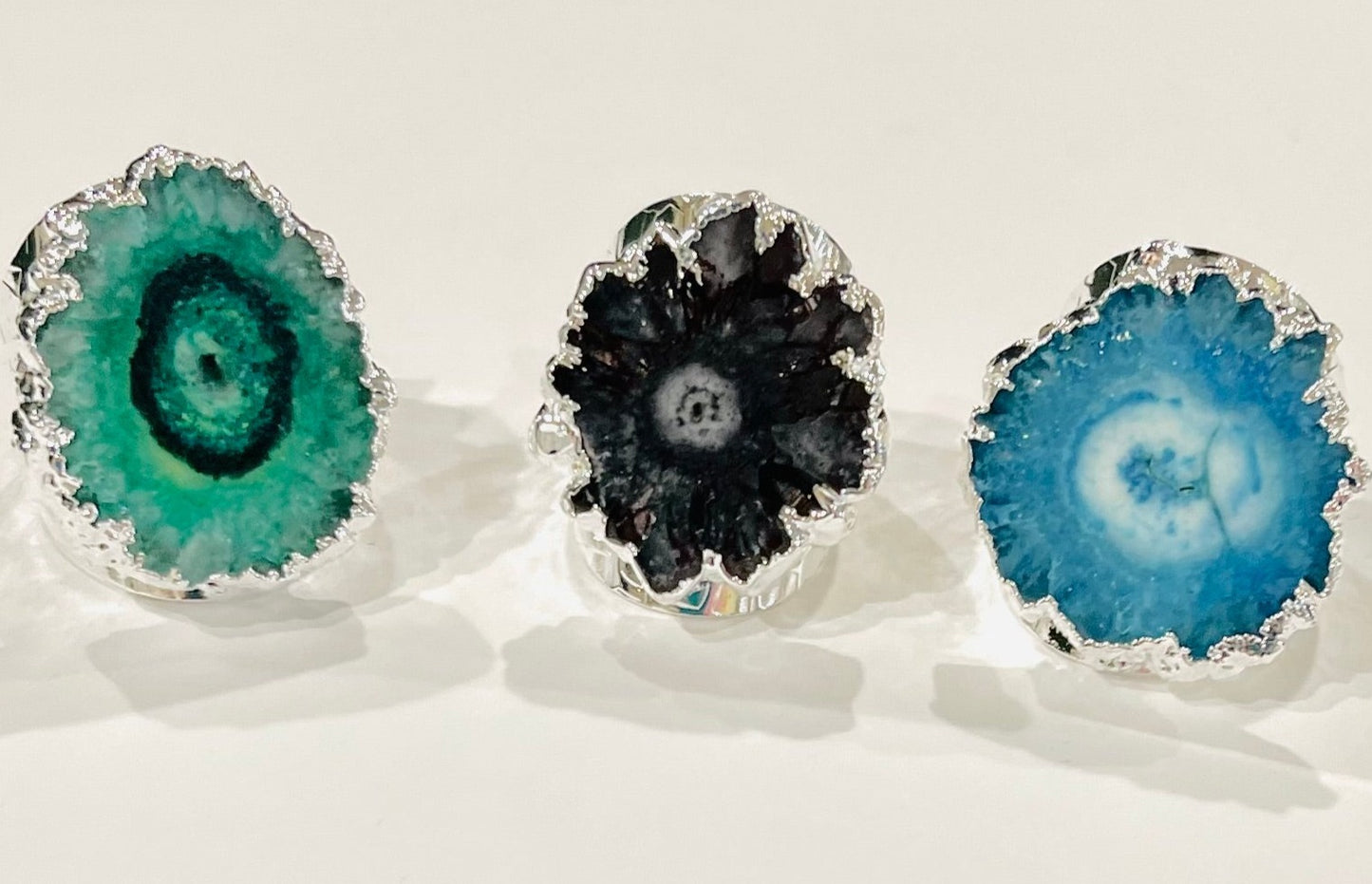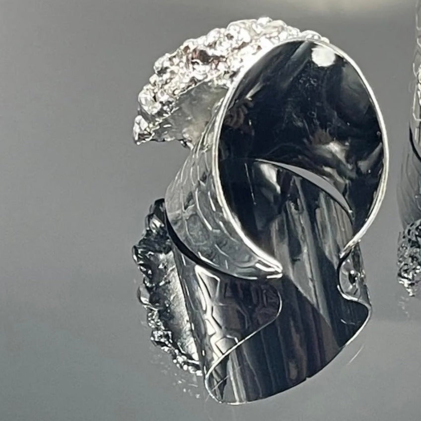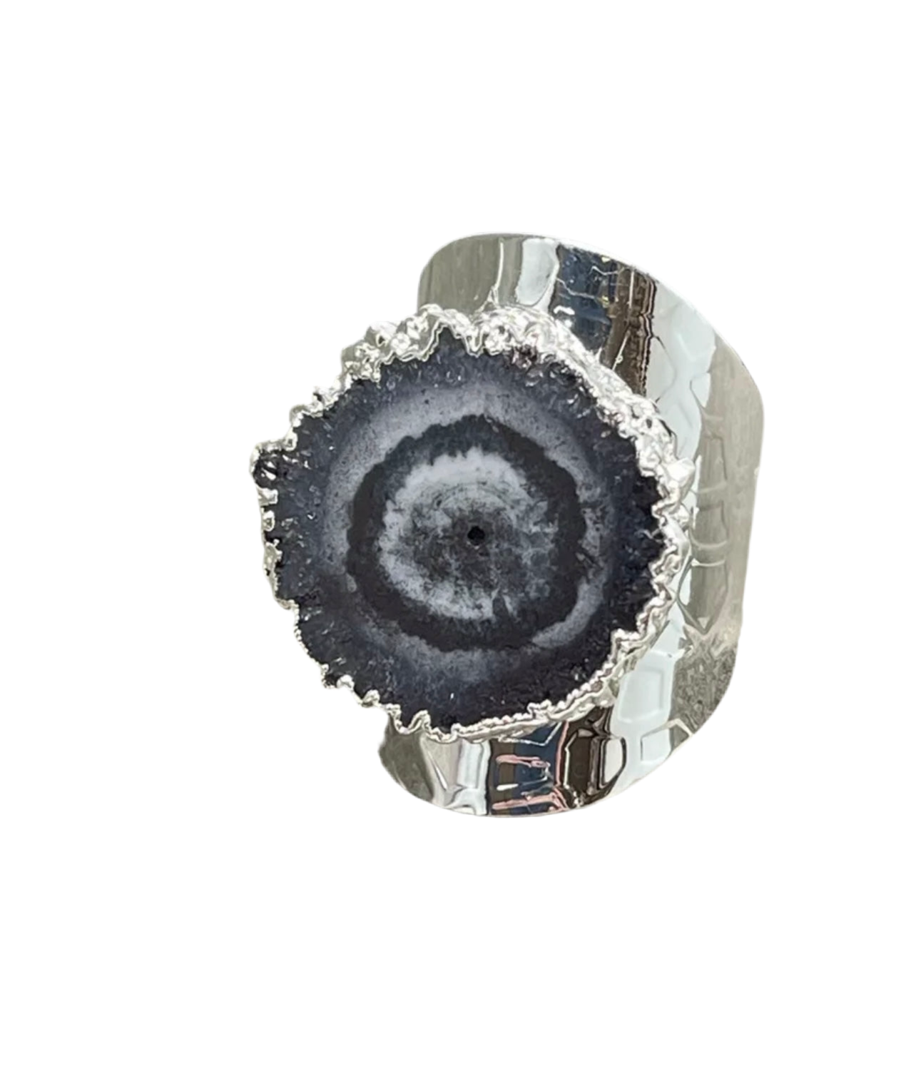 Stylish cigar-band style statement ring! This black Solar Geode Quartz ring is handmade around the natural shape of the (.5-1.0”) stone so no two rings will be the same. Adjustable to fit everyone on any finger. Silver electroplate. Super comfortable because it tapers in the back.