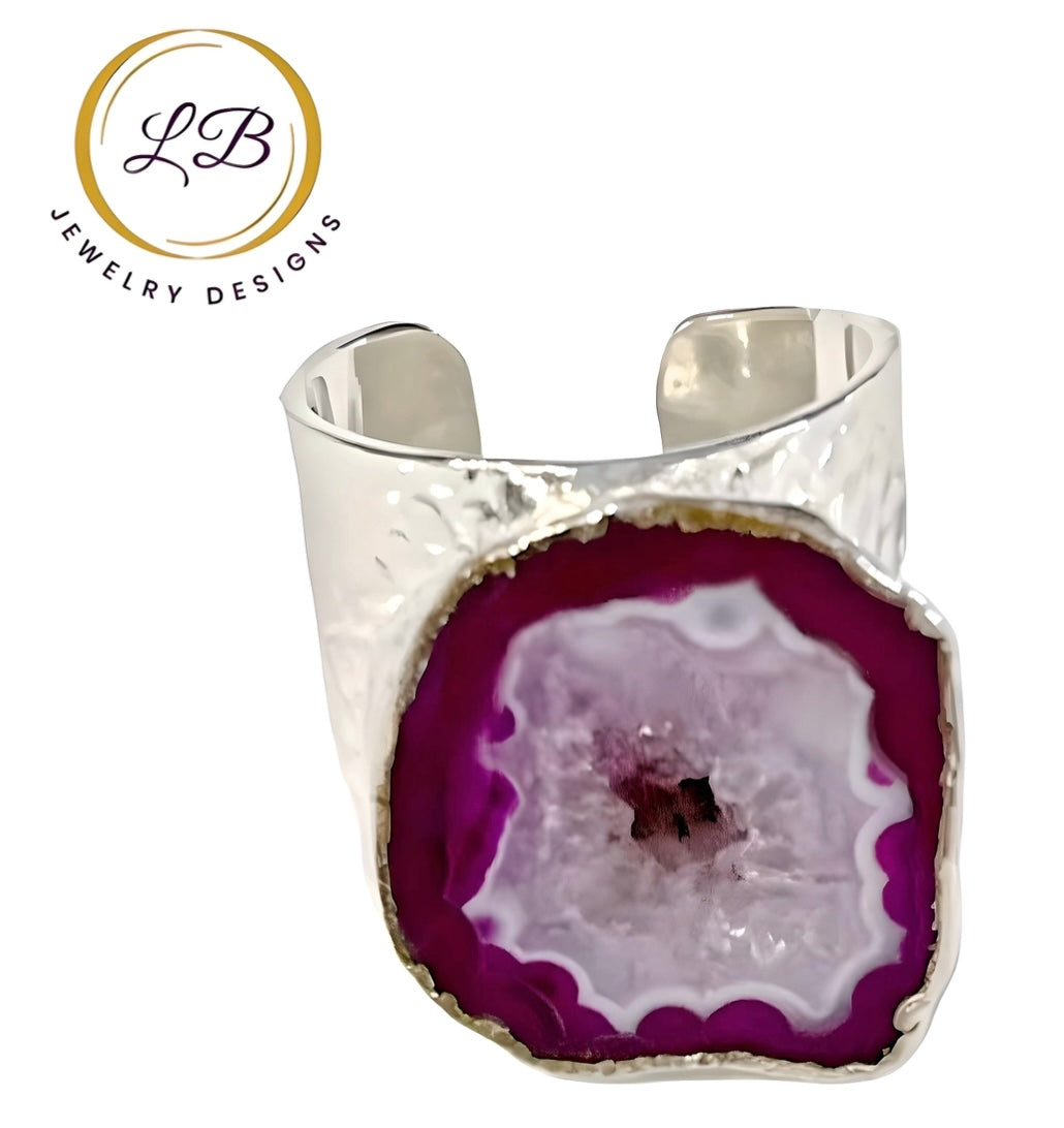 This adjustable cigar-band style ring showcases a stunning Purple Solar Geode stone set in silver. Each ring is crafted by hand, following the natural shape of the geode stone, ensuring that no two rings are identical. This one-of-a-kind ring is adjustable, suitable for any finger. The fusion of the patterned silver band and the solar geode results in a perfect balance of contemporary design and natural beauty, making this piece of jewelry truly exceptional.