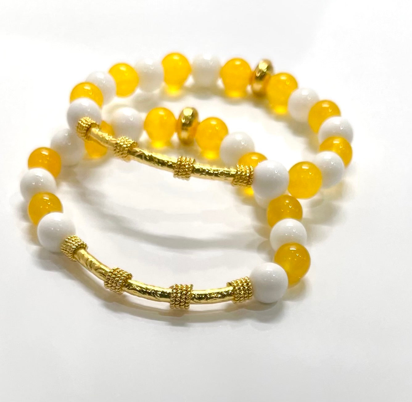 This elegant bracelet features a 45mm center tube Bali bead, made of 18k gold vermeil. The 7" beaded design includes white 8mm Alabaster and vibrant yellow Lemon Quartz gemstones, making it the perfect accessory for a stylish summer look.