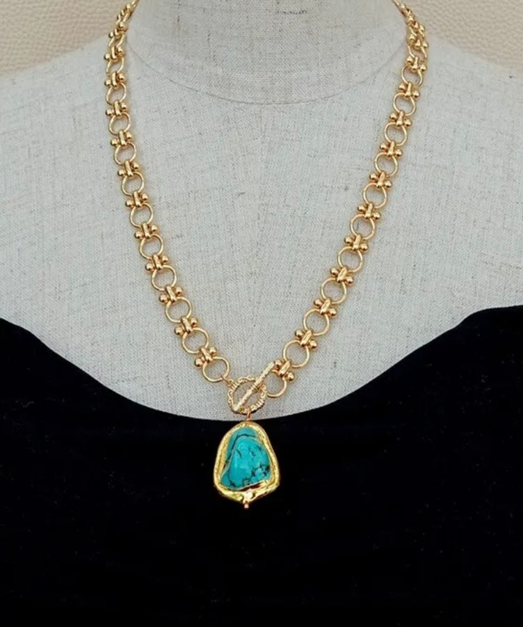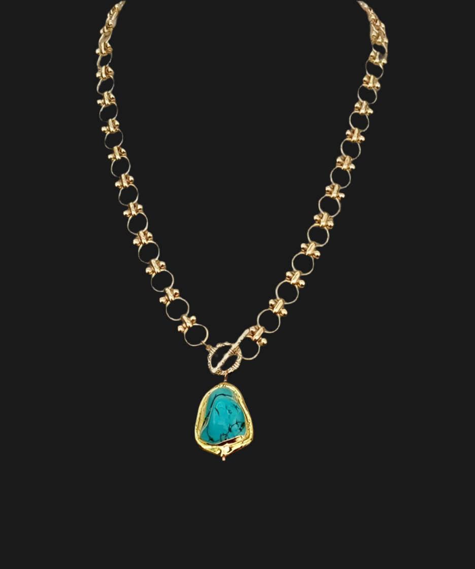 This jewelry ensemble creates a complete look that's sure to be loved. An 18" triple-knotted necklace of 8mm Lapis Lazuli and Turquoise stones, finished with a 18k gold plate clasp, is layered with an elegant 21" 18k gold-filled designer chain necklace with a stunning 22mm x 28mm Turquoise pendant detailed with 18k gold plating. Finishing off the set is a 7" bracelet of beaded Lapis and Turquoise stones with gold plate discs.