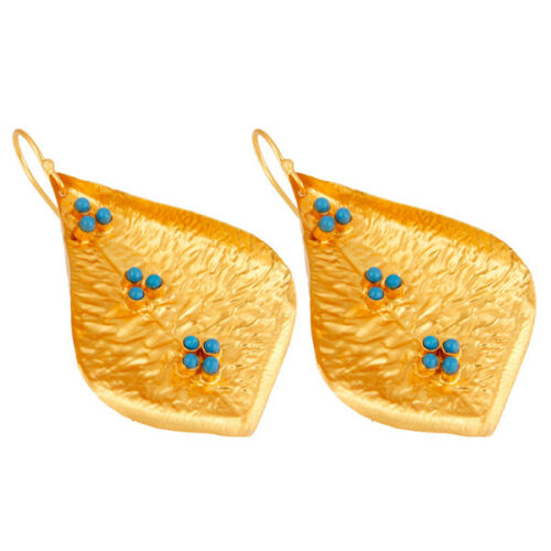22k Hammered Gold Leaf Turquoise Statement Earrings 2”