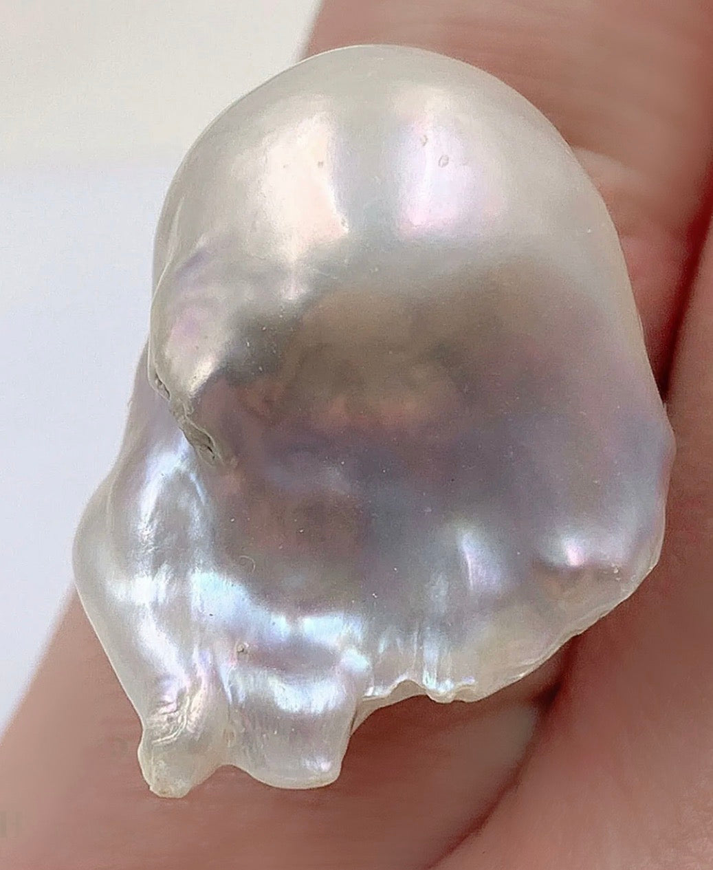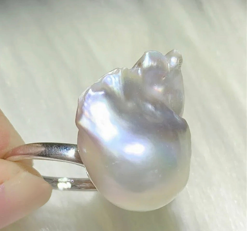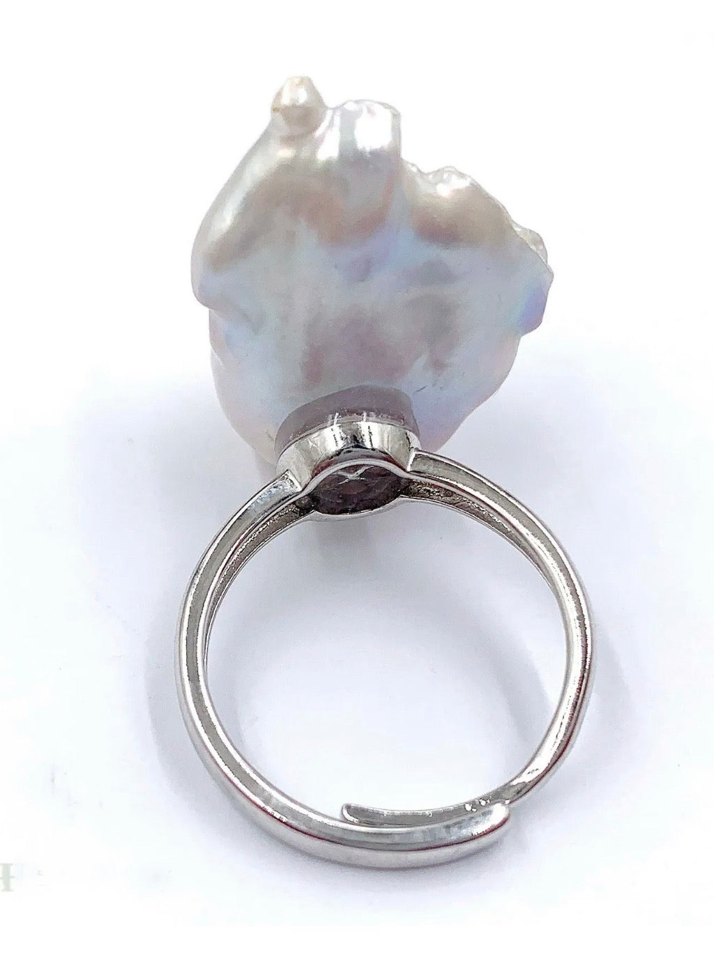 This ring is very unique with a beautiful free form design. The genuine, large irregular-shaped Baroque Pearl is set on a silver adjustable band with pave accents. The band is a size 9 and can be adjusted to a larger or smaller size.