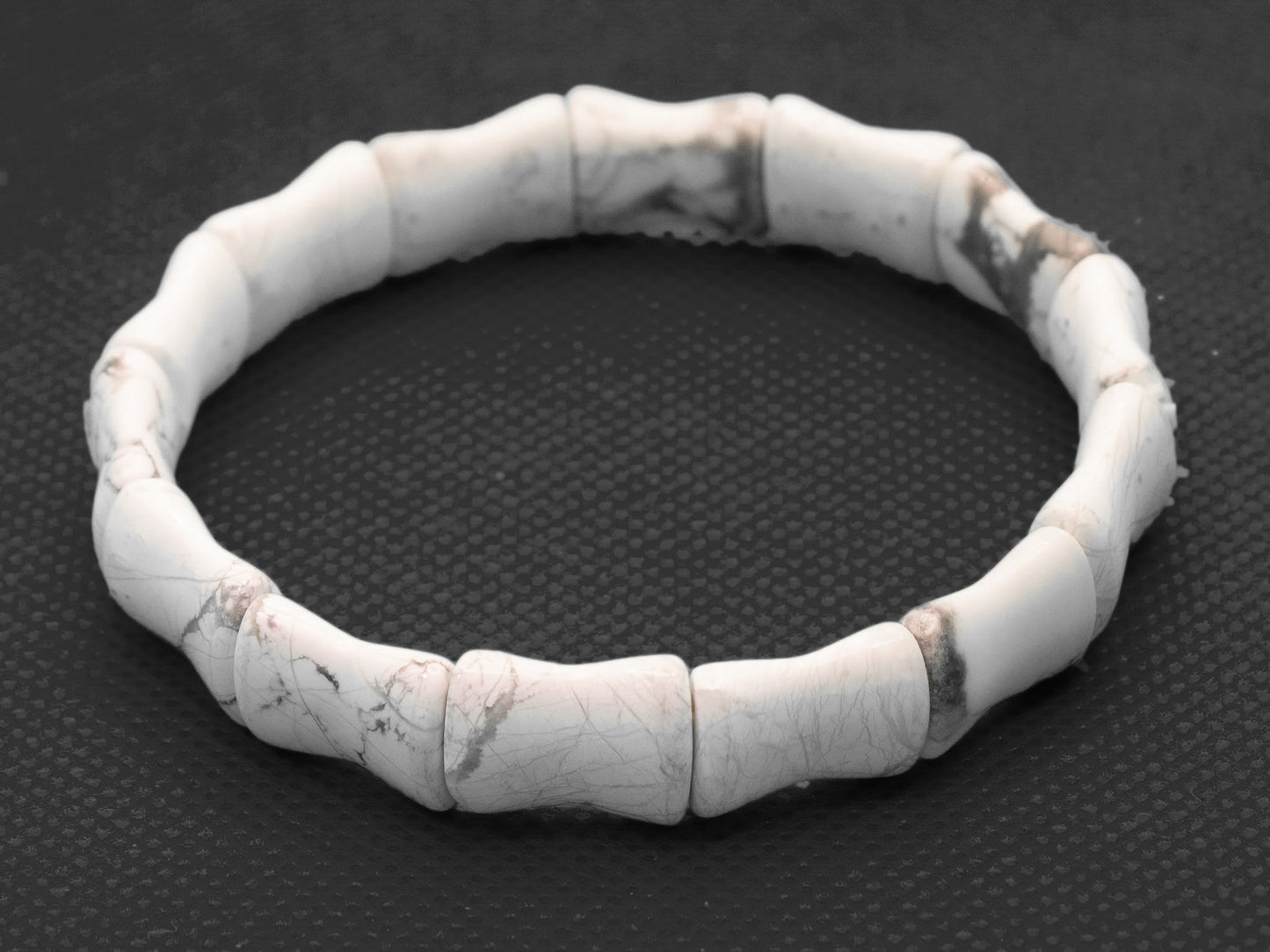 This is a wonderful neutral bracelet to wear year-round because of its white stone with grayish veins through it. It was made with bamboo-style beads and is 7" stretch.