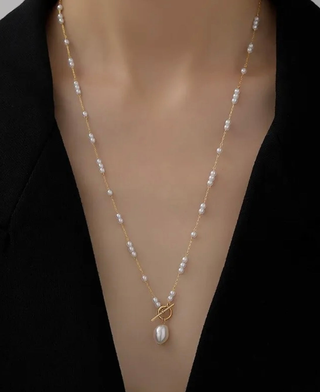 Dainty 18k gold filled chain with small freshwater pearls with a toggle clasp pearl pendant. 22”