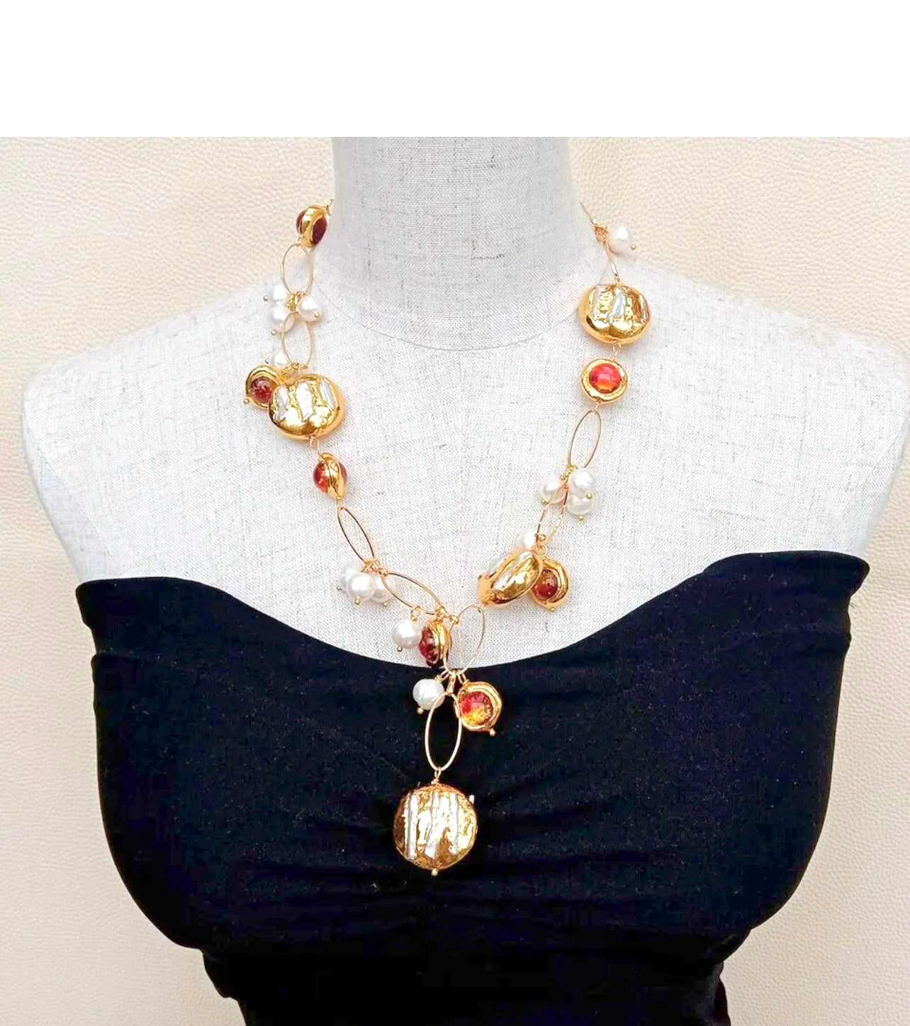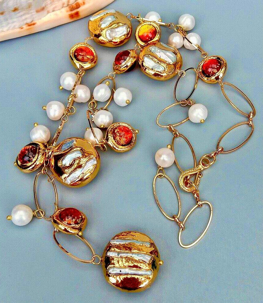 Orange Murano Baubles and Freshwater Pearls 22k Gold Chain Statement Necklace